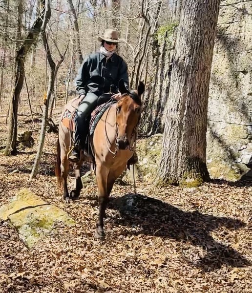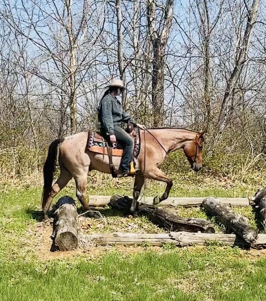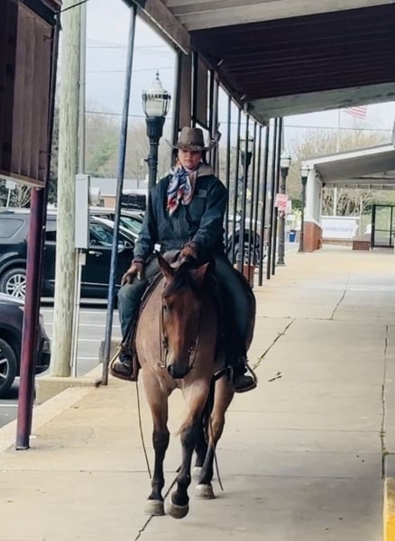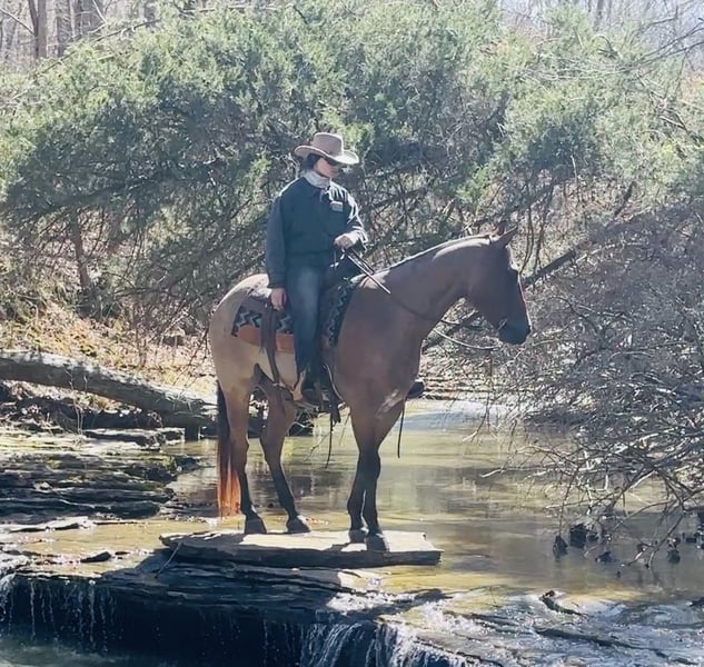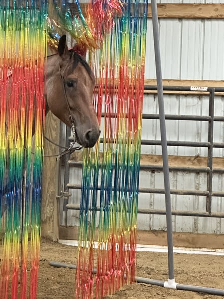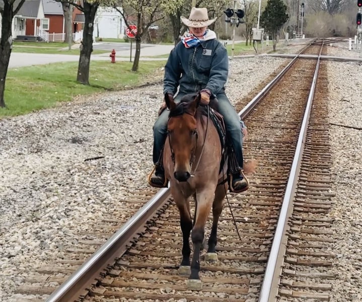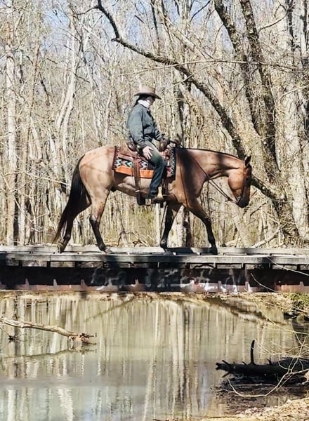 He is out standing on the trails and has been trail ridden through many different types of terrain. He is sure footed and honest. Chili will cross creeks, go through any body type of water, thick brush, logs, bridges, rough terrain, up and down cliffs with ease and has been through the obstacles. He has been rode through town, drive-thrus and traffic.