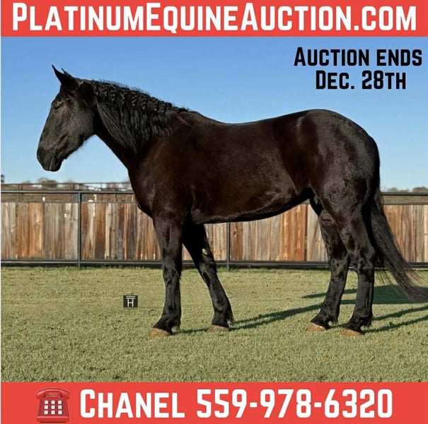 ONLINE AUCTION Place your bids at www.PlatinumEquineAuction.com Starting Bid $3500 Auction ends December 28th, 2025 Need a new saddle? Check out White Rock Saddles on our website or Facebook Smoke is a big, kind, quiet coming 4 year old Percheron gelding standing 17.1 hands tall. He is such a willing and sweet boy with so much potential. Smoke is broke to drive both single and double, is started under English tack and is great out on the trails. In the arena, Smoke is started well in both disciplines with great transitions. He is started over ground poles and small cross rails. He is soft and easy to ride and learns very quickly and easily. Outside, Smoke has a been there done that veteran mentality. He is confident and will go anywhere you point him. He will lead or follow and go whatever pace you like. On the ground, Smoke is sweet and friendly. He is easy to catch and enjoys attention. Smoke is broke to drive both single and double. He is off horse to his half brother, Coal, who is also available if you are interested in them both as a team. Smoke is sound, straight, and clean legged. He is UTD, good for the farrier, pastures well with others or pens alone like a gentleman. FMI call/text Chanel with Holland Horse Company 559-978-6320. Located in Jacksboro, TX. ONLINE AUCTION Place your bids at www.PlatinumEquineAuction.com Starting Bid $3500 Auction ends December 28th, 2025 Need a new saddle? Check out White Rock Saddles on our website or Facebook
