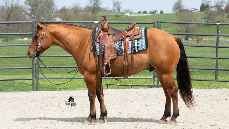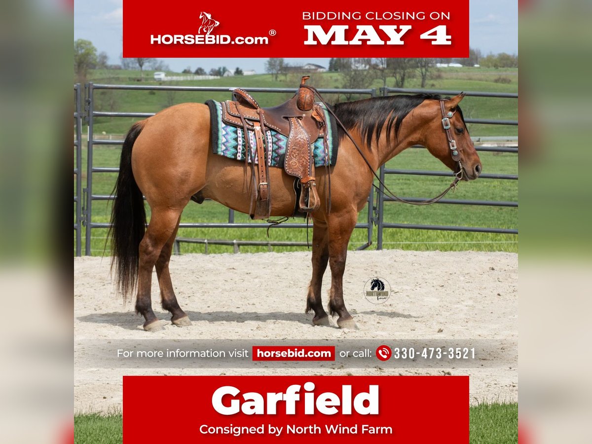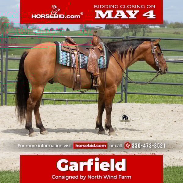 ▪️▫️◾️𝐭𝐡𝐞 𝑴𝒂𝒚 𝐒𝐞𝐥𝐞𝐜𝐭◾️▫️▪️ Happening now thru MONDAY | MAY 4th - Available EXCLUSIVELY on HorseBid's website! For more details and to register visit: www.Horsebid.com CONSIGNOR CONTACT: North Wind Farm 330-473-3521 LOCATION: Fredericksburg, OH BREED: AQHA REGISTERED: Yes REGISTERED NAME: Mr Blackburn 229 COLOR: Dun HEIGHT: 14.3 AGE: 4 GENDER: Gelding Garfield, aka Mr Blackburn 229 Garfield is a 4 yr old registered Dun AQHA gelding standing at 14.3hh. He is well trained to ride and a solid trail partner! Garfield is safe, fun, and extremely talented! He stands for grooming, tacking up, and for getting bathes. He loves turn out and gets along with the other horses in the pasture. Garfield is respectful and has good ground manners. Garfield rides nicely in the arena. He easily picks up both leads, has a big stop, and nice back up. He will move off of leg pressure and neck rein. He will also ride bareback as well as bridless. His walk, trot, canter is smooth and easy to ride. He will drag the jugs, doesn’t mind the tarp or the umbrella. He will go through all the obstacles as well! Garfield has done alot of outside riding and is great on the trails! He will cross creeks, step over logs, and is surefooted. He is used to being around dogs and atvs. Garfield has also been started on jumps and is doing great! He loves jumping and takes care of his rider. He pops over the jumps easily and looks great doing it! Garfield is a talented, young gelding with a lot of future!