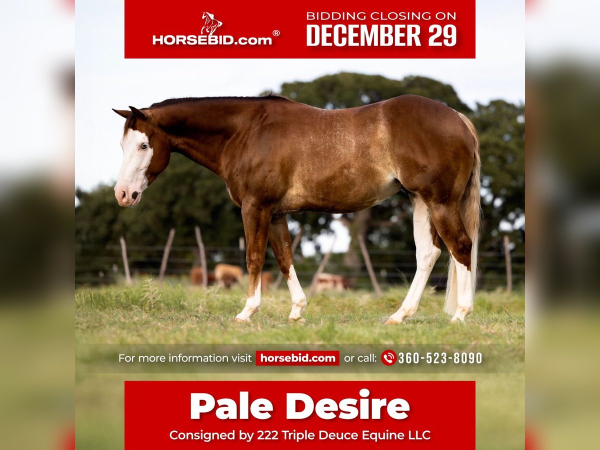 ⚜️ 𝓗𝓮𝓻𝓲𝓽𝓪𝓰𝓮 𝐖𝐢𝐧𝐭𝐞𝐫 𝓒𝓵𝓪𝓼𝓼𝓲𝓬⚜️ Happening now thru MONDAY | DECEMBER 29th - Available EXCLUSIVELY on HorseBid's website! For more details and to register visit: www.Horsebid.com CONSIGNOR CONTACT: 222 Triple Deuce Equine LLC 360-523-8090 LOCATION: Cisco, TX BREED: AQHA & APHA *DUAL REGISTRATION* REGISTERED: Yes REGISTERED NAME: Pale Desire 👑ROYAL CROWN ELIGIBLE👑 COLOR: Sorrel Overo HEIGHT: 14.2 AGE: 4 GENDER: Gelding Pale Desire, aka JoJo, is an eye-catching 4-year-old gelding registered with both AQHA and APHA. He is a son of the NRHA 5 Million Dollar Sire, Pale Face Dunnit, who is sired by the great Colonels Smoking Gun. JoJo’s dam is by Dual N Play, sired by NCHA Open Classic Champion Dual Pep. Jojo is a cool mashup of legendary reining horses, crossed with a proven set of champion cutters! On top of all that, he is ROYAL CROWN ELIGIBLE! 👑 We personally own this gelding and know him from head to hoof. Jojo has excelled in our program and has won over the hearts of all who have met and ridden him. We 100% stand behind Jojo and know you will love him the same way we do. We only sell our best horses, why you may ask? Well because it’s our livelihood and we simply can’t hog them all! JoJo is absolutely one-hand broke and ready to take to the show pen or roping arena. Jojo has been shown in the AQHA ranch riding and ranch rail. He was also Circuit Champion in the All-Breed Ranch Rail. Jojo is also started nicely on the head and heel side and would really stand out in a rope horse futurity program. He is a great hand on the ranch as well. JoJo neck reins great, is very soft in the bridle, and has smooth lead departures. His sweet and curious demeanor allows advanced kids to enjoy him as well! JoJo has proven to be a safe, solid, and sane mount. He is user friendly and packed with ability and talent. At the young age of four, he improves daily and shows more and more promise. It’s hard to come by horses like him that will last you a lifetime. JoJo has X-rays available on file, a fresh negative Coggins test, a clean health certificate, and has had zero exposure to the EHV-1 virus that has appeared in the last 30 days. This gelding is blemish free, has good feet and great conformation. AQHA and APHA papers are in hand. Jojo is slick, shiny, show fit and ready. He truly is just as beautiful as he looks. Jojo will come with a new full set of shoes, his winter blanket and his halter. Please enjoy JoJos current pictures and video. Feel free to call us with any questions that you may have. Shipping is available nationwide, we have insured haulers ready to bring Jojo to your door. Jojo is currently located in Cisco TX. Brayden 307-630-3578 Anna 360-523-8090
