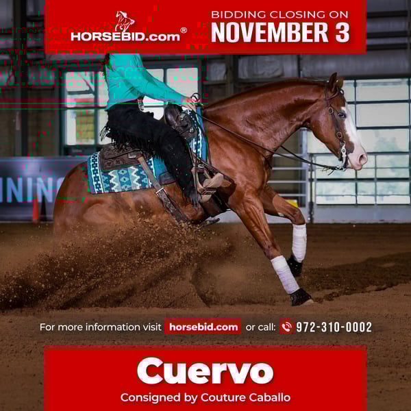 ⚜️𝐓𝐇𝐄 𝐅𝐀𝐋𝐋 𝐇𝐄𝐑𝐈𝐓𝐀𝐆𝐄 𝐂𝐋𝐀𝐒𝐒𝐈𝐂⚜️ Happening now thru MONDAY | NOVEMBER 3rd - Available EXCLUSIVELY on HorseBid's website! For more details and to register visit: www.Horsebid.com CONSIGNOR CONTACT: Couture Caballo 972-310-0002 LOCATION: Gainesville, TX BREED: AQHA REGISTERED: Yes REGISTERED NAME: Place Ur Bets COLOR: Sorrel HEIGHT: 14.3 AGE: 4 GENDER: Gelding Meet Place Ur Bets aka “Cuervo” A 2021 AQHA Sorrel Gelding by the $4.5 Million Dollar Sire Colonel Shining Gun and out of Eyedbeyourdreamgirl—a proven Magnum Chic Dream daughter owned by Clinton Anderson whose foals have already earned over $25,000. Trained by Ben Beckett Reining Horses and shown this year by Pond Hill Performance Horses, this gorgeous partial blue eyed gelding has proven his credibility in the reining pen, as well as the versatility too! Piloted by Bar MG Ranch, Cuervo recently claimed the 2025 Green Horse High Point Champion title earlier this month. He marked a 73.5 in trail, topped the ranch riding, and debuted impressively in the cow work with a third place finish. Quiet, sound, and sweet natured, “Cuervo” is one of the prettiest moving Shining Guns you’ll find. His fluid, unrestricted gait and comfortable way of going make him equally enjoyable for a youth, amateur, or seasoned open rider. He’s the kind that meets you at the gate every time—effortless & enjoyable to operate, honest in the pen, and enjoyable to ride day in and day out. The more time you spend with him, the more you realize—this one’s the total package. Sound, barefoot up front, no maintenance, no vices, and UTD on all care. Selling with a fresh set of x rays & vet statement. Offered exclusively by Couture Caballo, this is one investment you won’t second guess... a smart BET on a proven partner built for a lifetime of enjoyment.
