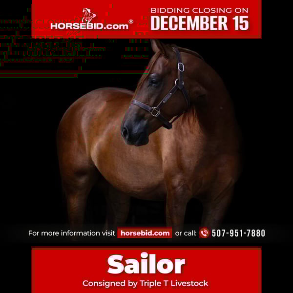 🎄𝐓𝐇𝐄 𝑯𝒐𝒍𝒊𝒅𝒂𝒚 𝐂𝐋𝐀𝐒𝐒𝐈𝐂🎄 Happening now thru MONDAY | DECEMBER 15th - Available EXCLUSIVELY on HorseBid's website! For more details and to register visit: www.Horsebid.com CONSIGNOR CONTACT: Triple T Livestock 507-951-7880 LOCATION: Nevis, MN BREED: AQHA REGISTERED: Yes REGISTERED NAME: RG Sailingwithguns COLOR: Sorrel HEIGHT: 14.3 AGE: 4 GENDER: Gelding Sailor is a 14.3 hand sorrel gelding that’s as fancy as he is kind. He’s pretty-headed, balanced and correct, with a long, flowing mane and tail that make him a standout wherever he goes. Sailor is a joy to have in the barn—gentle every day, easy to handle, and always the first to meet you at the gate. He’s got a willing disposition and loves to please, making him a fun, reliable partner whether you ride every day or once a week. In the arena, Sailor is reining-trained and knows all the maneuvers. He lopes smooth, collected circles, has an easy turnaround, and stops big. He stays soft in the face and rides off your seat and legs with feel. With his foundation, he’s the kind that could easily go show in ranch riding, reining, or versatility. If you’re looking for one that’s broke, capable, and has the talent to go show, he’s the right size, look, and kind to take you there. Out on the trail, Sailor is just as enjoyable. He rides quiet and confident down the road, across water, over logs, or through the pasture. He’s been hauled to town and is steady in new places. Whether you’re headed for a weekend ride with friends or checking fence after work, Sailor is the same every time—honest, steady, and always gentle. He has all the buttons but doesn’t require a tuned-up hand to enjoy them. Sailor is sired by Ifwhizswereguns, an NRHA earner of $118,636 and son of the great Spooks Gotta Gun (NRHA LTE $81,638, by Grays Starlight, LTE $41,128 and sire of over $12 million). His bottom side traces to Topsail Whiz, the NRHA’s first $12 million dollar sire and a true legend of the sport. With a pedigree full of proven performers and a training foundation to match, Sailor is bred and built to do it all. He’s the kind you’ll enjoy every day and be proud to saddle.