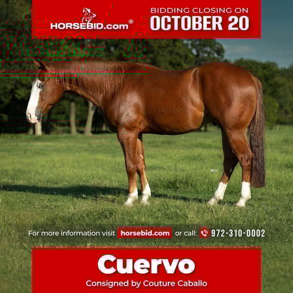♦️ 𝐭𝐡𝐞 𝐀𝐌𝐄𝐑𝐈𝐂𝐀𝐍 𝓕𝓪𝓵𝓵 𝓒𝓵𝓪𝓼𝓼𝓲𝓬 ♦️ Happening now thru MONDAY | OCTOBER 20th - Available EXCLUSIVELY on HorseBid's website! For more details and to register visit: www.Horsebid.com CONSIGNOR CONTACT: Couture Caballo 972-310-0002 LOCATION: Gainesville, TX BREED: AQHA REGISTERED: Yes REGISTERED NAME: Place Ur Bets COLOR: Sorrel HEIGHT: 14.3 AGE: 4 GENDER: Gelding Meet Place Ur Bets aka “Cuervo” A 2021 AQHA Sorrel Gelding by the $4.5 Million Dollar Sire Colonel Shining Gun and out of Eyedbeyourdreamgirl—a proven Magnum Chic Dream daughter owned by Clinton Anderson whose foals have already earned over $25,000. Trained by Ben Beckett Reining Horses and shown this year by Pond Hill Performance Horses, this gorgeous partial blue eyed gelding has proven his credibility in the reining pen, as well as the versatility too! Piloted by Bar MG Ranch, Cuervo recently claimed the 2025 Green Horse High Point Champion title earlier this month. He marked a 73.5 in trail, topped the ranch riding, and debuted impressively in the cow work with a third place finish. Quiet, sound, and sweet natured, “Cuervo” is one of the prettiest moving Shining Guns you’ll find. His fluid, unrestricted gait and comfortable way of going make him equally enjoyable for a youth, amateur, or seasoned open rider. He’s the kind that meets you at the gate every time—effortless & enjoyable to operate, honest in the pen, and enjoyable to ride day in and day out. The more time you spend with him, the more you realize—this one’s the total package. Sound, barefoot up front, no maintenance, no vices, and UTD on all care. Selling with a fresh set of x rays & vet statement. Offered exclusively by Couture Caballo, this is one investment you won’t second guess... a smart BET on a proven partner built for a lifetime of enjoyment.
