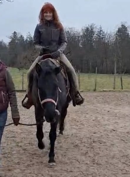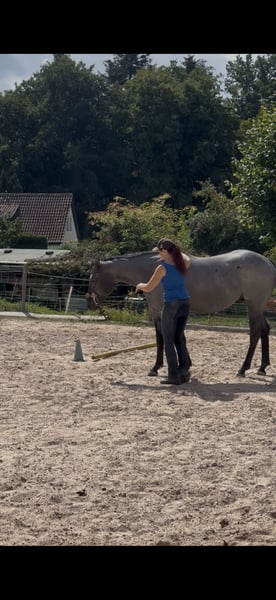 Silver ist ein sehr gelehriger und bildschöner Wallach, in der Sonderfarbe Blue Roan, der sehr gerne arbeitet. Er ist im Stutenverband geboren und aufgewachsen. Momentan steht er mit 3 Stuten und einem Wallach im Offenstall. Sein Vater ist MJM Salty Blue Ezra ein Hancock Horse also ein Ranchhorse. Silver hat große und feste Hufe, ein stabiles Gebäude und auch als Gewichtsträger geeignet. Er ist Schmiede und verladefromm, am Boden gearbeitet und als Handpferd mit Sattel im Gelände gearbeitet. Er ist sehr intelligent, wissbegierig, gelehrig, verspielt und Menschenbezogen. Bei Interesse bitte per WhatsApp, ich antworte nicht auf Nachrichten nur auf WhatsApp