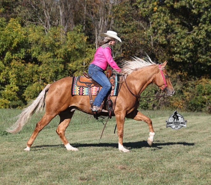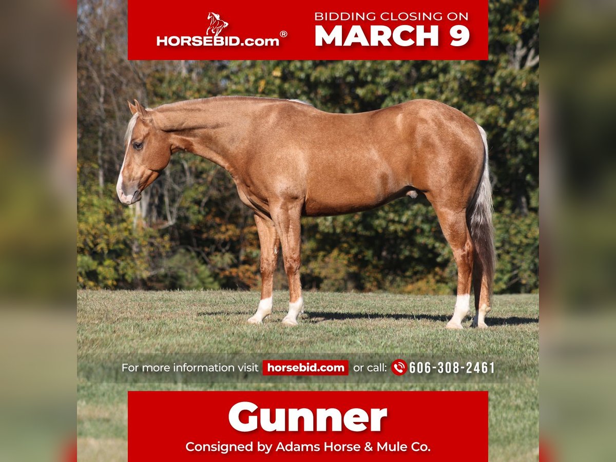 ℳ𝒶𝓇𝒸𝒽 ♦️𝐑𝐈𝐃𝐄𝐑'𝐒 𝐂𝐇𝐎𝐈𝐂𝐄♦️ Happening now thru MONDAY | MARCH 9th - Available EXCLUSIVELY on HorseBid's website! For more details and to register visit: www.Horsebid.com CONSIGNOR CONTACT: Adams Horse & Mule Co. 606-308-2461 LOCATION: Mt Vernon, KY BREED: AQHA REGISTERED: Yes REGISTERED NAME: Gunners Whimpy Chex COLOR: Palomino HEIGHT: 15.1 AGE: 5 GENDER: Gelding CHEX this guy out!!! Gunners Whimpy Chex is a 2021 model reg AQHA, gelding that is standing 15.1hh with a very stocky build. Gunner has something to offer everyone… if you want pretty, he is wearing a golden coat, has a heart of gold and has four white socks with a thin blaze to go along with it, making a perfect combination of chrome and class. If you are a pedigree person… Gunner has an all-star lineup in his family tree, ML Gunnerito who is sired by the legendary Pale Face Dunnit, Hollywood Dun It, Colonels Smoking Gun, Gallo Del Cielo (AKA Rooster) and Nu Check To Cash… and he only gets more impressive once you get in the saddle! To start with Gunner is trained to lay down on cue. He knows all the reining maneuvers and would be a great horse to put in the ranch shows! He lopes nice circles, slowly on a draped rein, has a great stop, spins both ways, side passes to open/shut gates and has a good reverse. Gunner has a great mind, he is very laid back and loves attention. He enjoys being pampered by the kids whether that be a spa day with a bubble bath or getting glittered up for a photoshoot. Although he is a preppy guy, he is always up for a fun trail ride through the mud and rough country! Gunner has carried the kids through the rough rocky terrain, deep water, thick mud and up/down steep slopes. He has been ridden in several different states, including Texas and the deserts of Arizona. Gunner never gets in a hurry and is very sure footed making him a great ride for a beginner type rider. Gunner has been roped off of out of the box on the heel side and he will put you in position to get an honest shot at the heels every time. He has been ridden around the ranch, herded, sorted and pasture roped. Things are always calm and quiet out on the trails and around the ranch but don’t worry, Gunner knows the sound of a roaring rodeo crowd of 3000 people, screaming and cheering as the speakers blare Kid Rock’s song “Born Free”, as he lopes around the arena carrying the flag at the grand entry. While at the rodeo Gunner was been used to sort, pen and load rodeo bulls. The girls also used him to give “pony rides” on at 4 different rodeos. They had all ages of kids and adults stand in line for a ride on their horses. Gunner has been ridden down the highways, through town, the drive thru, by Walmart and he will be traffic safe! He has been under English tack and will go over the rails with ease. Gunner is not spooky and has been around tarps, wind dancers, bull whips and gun fire. Gunner has been Movie Star good looks, an All-Star pedigree, Rideability, Safe, Smart, Experienced, Versatile… yes he certainly does CHEX all of the boxes!!! Gunner accompanied by our 2-week guarantee, sells with a fresh PPE and X-rays. For more info or to come see him in person, contact Eric with Adams Horse & Mule Co. at 606-308-2461. Located in Mt. Vernon, KY.