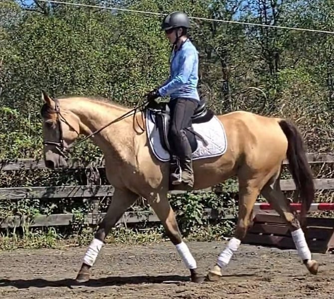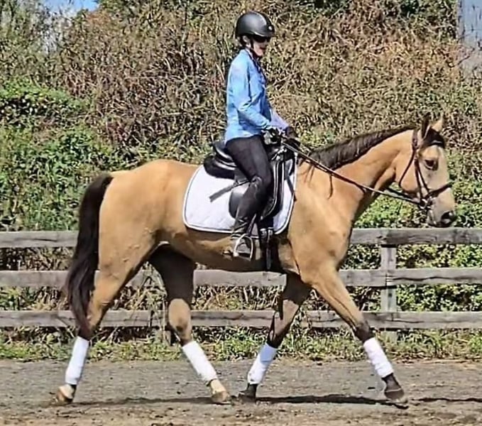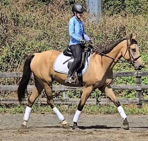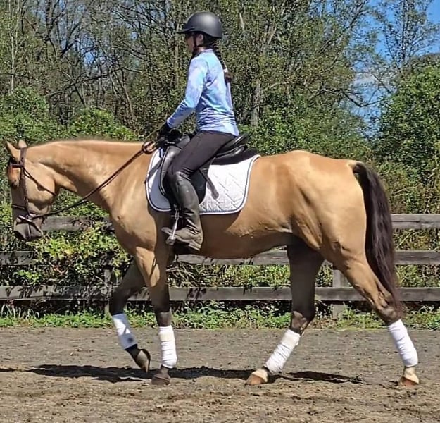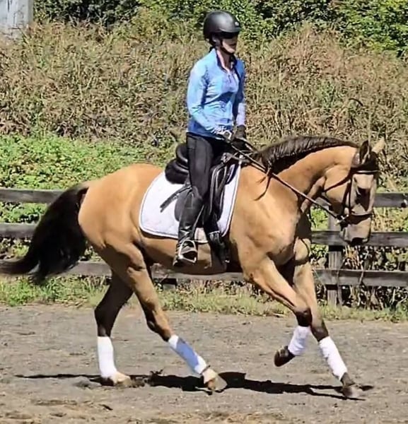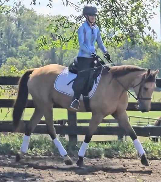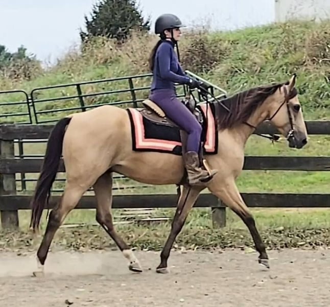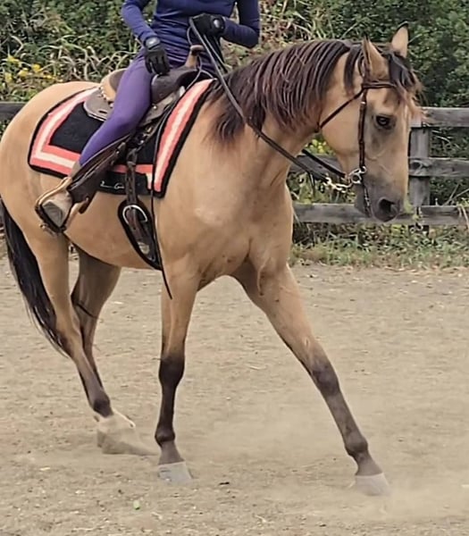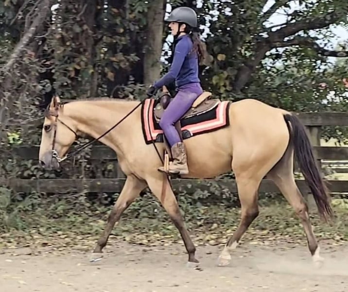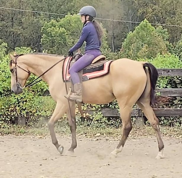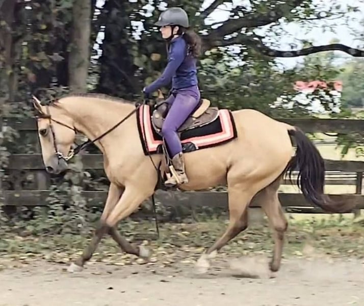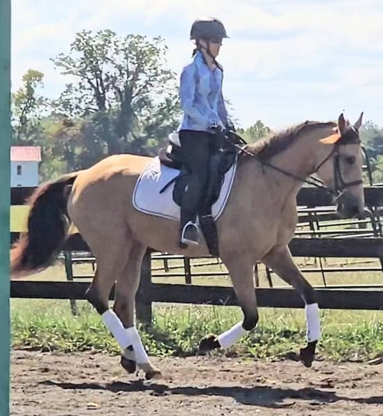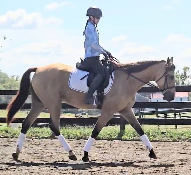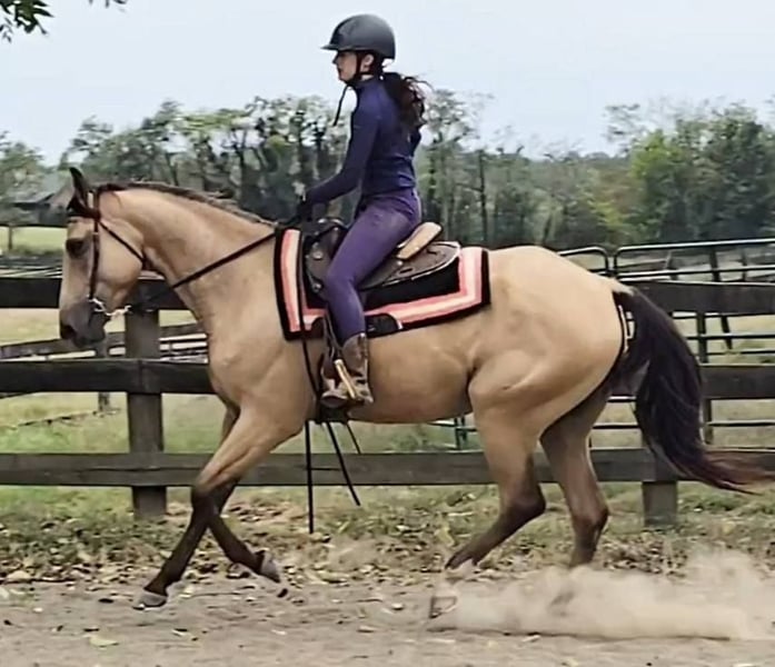 "AVAILABLE ON ONLINE HORSE AUCTION AT www DOT MagicHorseAuction DOT com BIDDING OPEN NOW thru TUESDAY | November 11TH! - BUY IT NOW AVAILABLE! *Final price will be determined on auction site* CONSIGNOR CONTACT INFO: Nicole Ingrassia 571-289-2947 LOCATION: Jeffersonton, VA "Ripple In Time, aka ""RIPLEY"" Ripley is a beautiful, eye-catching buckskin grade QH Appendix gelding. He stick measures at the perfect size of 15.3H, making him big enough for many sizes of riders while also being a manageable size for more petite riders as well! Ripley is 5 years old, coming 6, and he has his whole life ahead of him. This bright and promising gelding has already been lovingly trained in both Western and English disciplines. Ripley will 1-handed neck rein, pick up the canter from the walk, side-pass, has a great stop, and is responsive to cues from the seat, leg, to bit pressure and moves off the leg without needing spur or crop. Ripley is one of the most comfortable horses I have ever ridden! He is butterly smooth to ride, sitting his walk trot canter is like silk! In English tack, Ripley has a foundation in dressage, and is currently schooling training and first level. He loves having a job to do and does not get bored with arena work and he loves dressage! He is a gorgeous mover with a lovely flatkneed trot, and he will happily frame up onto contact or go on a loose rein. Ripley has also been trained over jumps, and he canters a lovely course of jumps with fillers and solid obstacles. He jumps out of stride and has a ""hunter round"" look to him and he is suitable to continue in the hunter ring if his new owner wishes. Ripley has very nice manners, is easy to catch, likes attention, and has no vices. He is easy to have around, not a hard keeper, and he is not on any maintenance. Ripley is healthy and sound and clean legged with no blemishes. He has not had any injuries or illnesses and he is healthy and UTD on vaccines, dental, deworming, farrier, and coggins. We have clean x-rays on file for Ripley available as a courtesy, and buyers are welcome to do their own PPE as well at their expense. Ripley loads in a trailer, ships, ties and cross-ties, lunges, bathes, is not afraid of clippers, gets along well with others in turn out, can be stalled or live out, and is a maintenance-free kind of guy. If you are looking for a quality, talented, sweet gelding, a buckskin on top of everything, don't miss out! Please reach out with any questions or if you would like to come ride him. We are also happy to assist with a video call with interested buyers. Don't miss out on the horse of your dreams!