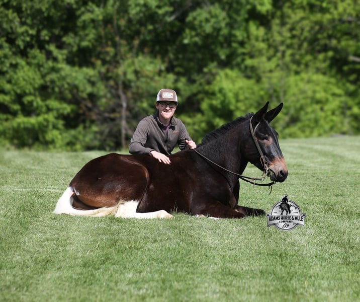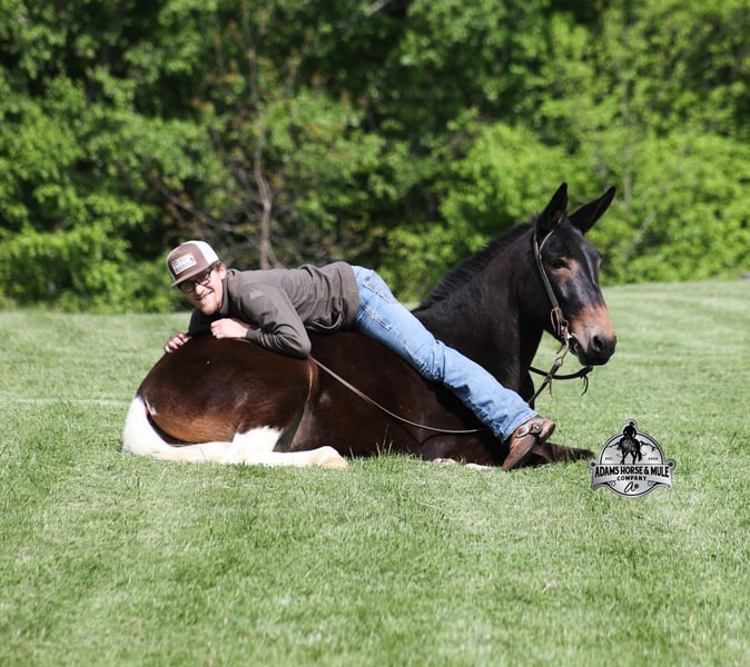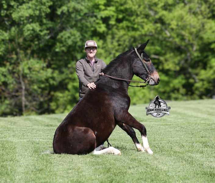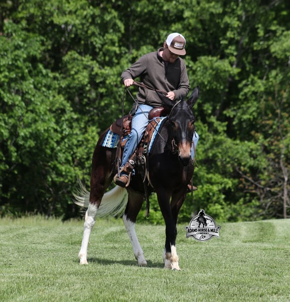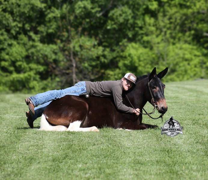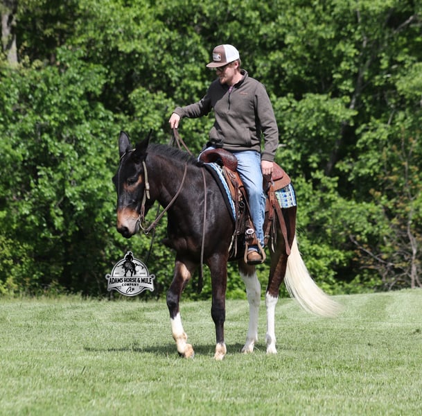If you are a lifelong mule fan or just looking for your first one… Lariat is the one for you!!! If you want smart, reliable, easy going, user friendly, safe and a best friend… all wrapped into one??? Here he is! Lariat was started and trained by the best in the business when he was two and a half years old and has graduated the natural horsemanship program where he learned several tricks (side passing to a mounting block, laying down for mounting and setting on his rump) doing the natural horsemanship program also allowed Lariat’s personality to shine as he is a total in your pocket kind of fellow and is everyone’s best friend! He is 4 years old, is 15.1h and is well built. Lariat is a mule for all jobs… he is out of a Color Me Smart ($3.6 million sire) bred mare, so he is bred to ride around the ranch and knows cows! Whether you need to head out on the ranch and herd some cattle, need to heel calves and drag them to the branding fire, if you just want to ride some beginner type trails, if you want to go hunting up in the high country of Wyoming or Colorado and tackle the roughest of all trails, if you want to hook up and take a Sunday afternoon carriage ride, maybe you just want a friend to lay down under a shade tree and talk to… Lariat will do it all!!! He is super safe, absolutely no foolishness or bad habits. He is easy with feet and ears. Lariat has been ridden by all ages from 6 to 76 and is 100% safe. On the trails he is great and will cross creeks, ditches, logs and navigate rough, rocky areas. He has been ridden many miles in the mountains of Eastern Kentucky and encountered every obstacle possible on the trails. He has been on several week long camping trips. He has been elk hunting out west and also has been packed. He hauls well and picket line ties and ponies. He will go up or down even the steepest slopes, across deep creeks, over downed trees, and over all types of rough terrain while still being sure footed. Lariat has been ridden at night, lead dogs and been coon hunted off of, gun fire does not bother him. Lariat is fancy broke and well trained! He will one hand rein around, spin circles, side pass and back with ease. He will lope perfect circles and slide stops! He has been exposed to all kinds of wildlife such as deer or turkey and will go anywhere that he is asked too. You will drive the wheels off of a new truck to find one that even close to Lariat, we invite anyone to come see in person just how special he is or we can facetime with you as well. Just give us a call and feel free to call Eric 606-308-2461 with any questions. Go to visit our website for more pics and a video www.AdamsHorseAndMuleCo.com AHAMC has been in the horse business and sold horses over the internet since 2005. We have a long track record of success with hundreds of happy customers. We work hard to match riders with the correct horses and specialize in beginner safe, family friendly horses that have been used and checked out by our family! We can set up transportation anywhere in the US and look forward to working with you.