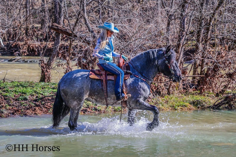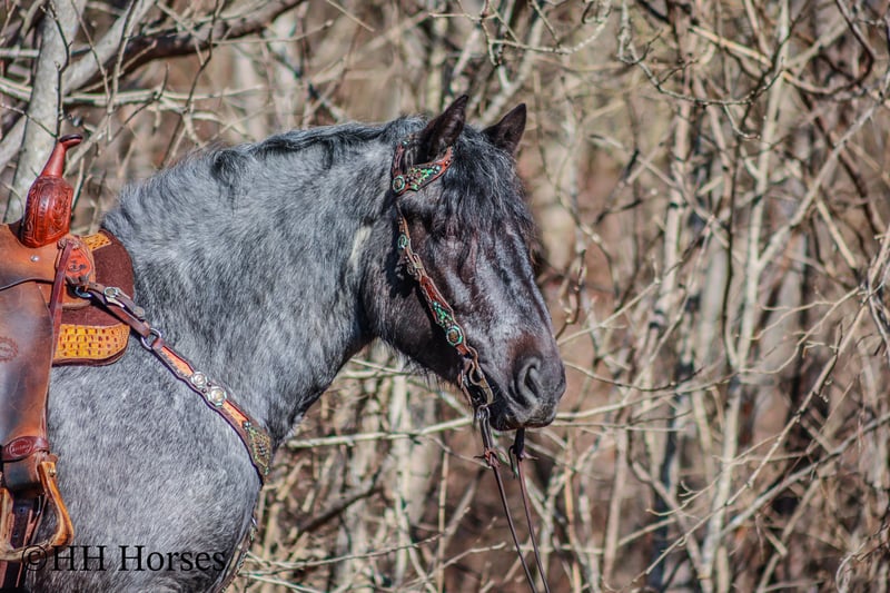 ONLINE AUCTION Place your bids at www.PlatinumEquineAuction.com Starting Bid $3500 Auction ends February 23rd, 2025 Need a new saddle? Check out White Rock Saddles on our website or Facebook! This is “MISS APPALACHIA”, a gorgeous, stout made, smart, strong yet gentle, well trained TRUE BLUE ROAN BRABANT MARE that is broke to ride and drive. This mare is not only well built with really cool color, but extremely intelligent, civilized, and nice to be around. She stands 15.3 hands tall and is 4 years old. She has been ridden English and Western in the indoor arenas and outdoor arenas. She has been out on the trails, through the water, ridden in the thick brush, through mud, ice, and snow. She has been on rocky mountainous terrain and handles it well. She is sure footed and stays in four wheel drive. It will not get too deep or too steep for her. We have taken her through the cross country driving courses and she will cross water quietly under tack or harness. She is brave, honest, solid, and sincere. She has been driven on the roads, in a few parades, and she is traffic safe. She is responsive and fun to ride with a big solid stop. She backs up and is loping circles in the arena. She will also ride out in the open and lopes off quietly with no hump and no buck. She stands to harness, hitch, tack, mount, and groom. She aims to please and has a great personality that makes her a pleasure. She is versatile, will hook up and work, drive a cart or wagon, and tack up and ride off nicely. Don’t miss out if you want a big cool TRUE BLUE BRABANT. Located in Flemingsburg, KY. For more info or to make a BUY IT NOW offer contact HH Horses Erin 304-238-4155. ONLINE AUCTION Place your bids at www.PlatinumEquineAuction.com Starting Bid $3500 Auction ends February 23rd, 2025 Need a new saddle? Check out White Rock Saddles on our website or Facebook!