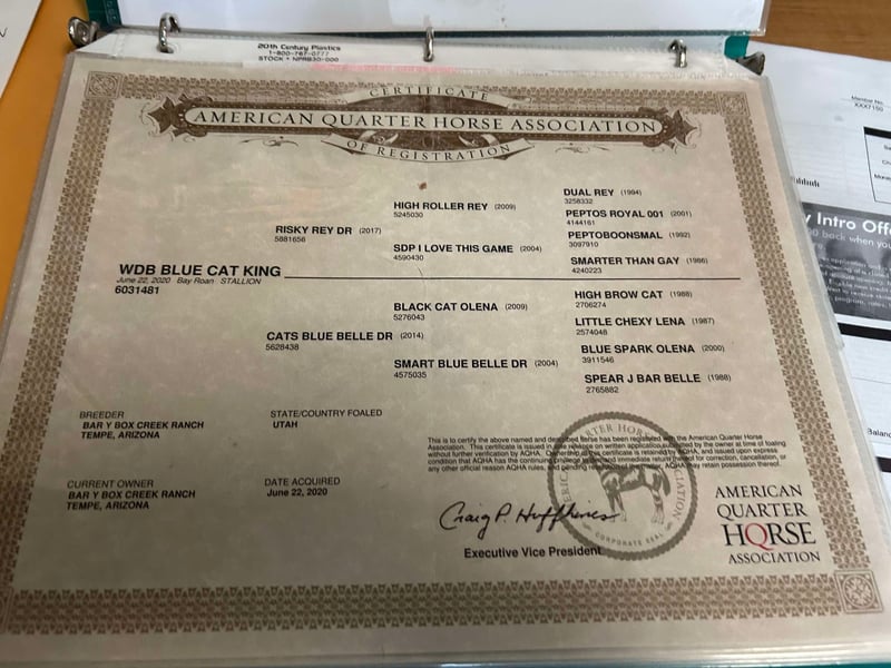 ONLINE AUCTION Place your bids at www.PlatinumEquineAuction.com Starting Bid $3500 Auction ends September 8th, 2024 Need a new saddle? Check out White Rock Saddles on our website or Facebook! Blue Cat King aka “Pepe” is 4 yr old AQHA gelding. He stands 14.1 hands tall. He has an excellent pedigree that goes back to Dual Rey and HIGH BROW CAT!!! Pepe has been hauled across Arizona, California, and Nevada. He has spent extensive time on ranches and even in the bright lights of Las Vegas. There is not much that phases him, with his eagerness to please and confidence to keep going. He is a gentleman around other horses and easy to get along with. Pepe has a bright future with any direction someone chooses to go with him, whether it’s a performance horse or a trail horse. He has been lightly started in roping and has exposure to many cattle, with lots of time out on the trail. He handles any obstacle that is in his path with ease! He can stop hard and turn around in an arena or easy around any trail you put him on. He’s sure footed and happy to go anywhere. Located in Scottsdale, AZ. If you have any questions feel free to call Cardon Livestock Casey 661-747-6555. ONLINE AUCTION Place your bids at www.PlatinumEquineAuction.com Starting Bid $3500 Auction ends September 8th, 2024 Need a new saddle? Check out White Rock Saddles on our website or Facebook!