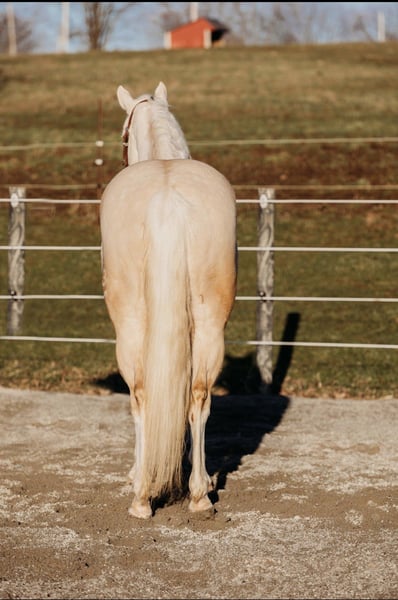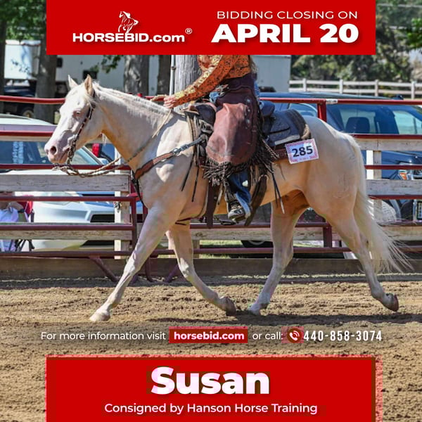 ⚜️𝐭𝐡𝐞 𝓔𝓵𝓲𝓽𝓮 𝐒𝐩𝐫𝐢𝐧𝐠 𝐂𝐥𝐚𝐬𝐬𝐢𝐜⚜️ Happening now thru MONDAY | APRIL 20th - Available EXCLUSIVELY on HorseBid's website! For more details and to register visit: www.Horsebid.com CONSIGNOR CONTACT: Hanson Horse Training 440-858-3074 LOCATION: Andover, OH BREED: Quarter Horse REGISTERED: Yes REGISTERED NAME: BH A Boy Named Sue COLOR: Cremello/light palomino HEIGHT: 14.3 AGE: 6 GENDER: Gelding 2020 AQHA Cremello Gelding 14.3hh https://youtu.be/KE4Tl6Z6HuA?feature=shared Yes, this gelding’s name is Susan. His registered name is “A boy named Sue” Susan is the name that always stuck with him since he was born. I raised this gelding from a foal. He stands 14.3hh. His mother is one of my all-time favorite mares and his sire is the great and late “Big Chex to Cash.” He has been my favorite foal since day one. Susan has a very well-rounded education; having been used for a lot of my intermediate lessons, hauled out for trail rides, shown in a lot of ranch shows. I even showed him at the All-American Quarter Horse Congress in 2025 with my broken ribs and a punctured lung. He took great care of me, piloting through the ranch trail and ranch riding classes. He is a phenomenal prospect to be a high-end ranch performance horse or any other discipline you choose. With his beautiful gaits, he could even excel as an all-around show horse. Susan is a beautiful mover, and one of the prettiest horses. He’s an absolute joy to ride, he’s very trainable and kind, and has smooth, lovely gaits. Susan has never had any injections or maintenance of any kind; and has never been unsound. I’ve very proud to offer this quality gelding and looking forward to seeing where his future takes him. He has a lot of quality professional training and has so much to offer his new owners. This will be a hard one for me to let go as a breeder and trainer, but it’s time for him to excel in his new home. He sells with a certificate of soundness and vaccinations. I also have x-rays available and can email them to anyone interested! If you would like to know more about him or come try him, call 440-858-3074. PPE very welcomed at buyer’s expense *Susan is a light cribber controlled with a collar*