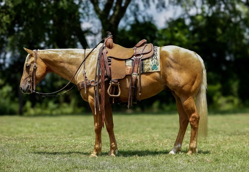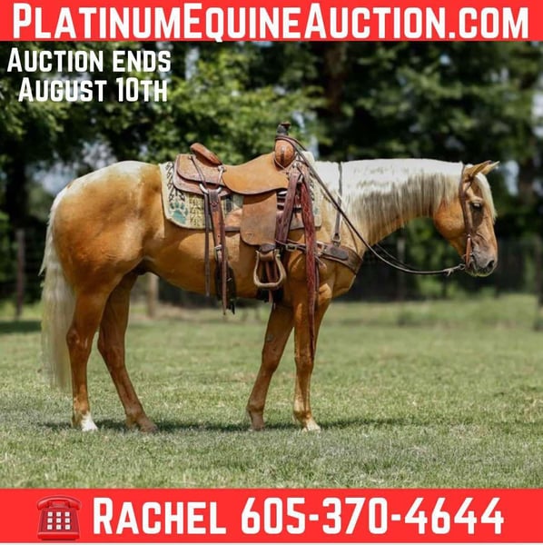 ONLINE AUCTION Place your bids at www.PlatinumEquineAuction.com Starting Bid $3500 Auction ends August 10th, 2025 Need a new saddle? Check out White Rock Saddles on our website or Facebook ASM Moon Rocket AKA Sunny is a 2020 model palomino gelding, he stands 14.3 hands tall. He is clean legged, straight and correct! Sunny is sweet and has a friendly personality! He has been extensively trained, with a focus on versatility! Sunny has been used extensively around the ranch, proving his worth in various tasks. He is very well suited for cattle work and has done all aspects of ranch work, whether you’re sorting, roping, or moving cattle, he is up to the challenge. Sunny has also spent a lot of time in the arena and has a reining foundation! He knows all the reining maneuvers and rides collected and stays soft in the face! He has a rocking chair lope, a nice stop and is a true joy to ride! He’s also comfortable with trail riding, and goes through, over and under all types of terrain, obstacles, and water. He is sure footed and can handle a full day, making him a great all around horse for both work and pleasure. The possibilities are absolutely endless for this gelding whether you head to the ranch shows, ranch sorting, or want yourself a nice trail horse. Sunny has a gentle demeanor and is eager to please, making him a joy to work with if you’re looking for a prospect in the arena for a heel horse or breakaway! Sunny stands tied for the farrier, grooming, saddling, and bathes. He is easy to catch and is gentle and quiet to be around! Super nice young gelding, you won’t want to miss him! Call or text Rachel with TR Livestock 605-370-4644 for more info! Located in Rusk TX, nationwide shipping available! ONLINE AUCTION Place your bids at www.PlatinumEquineAuction.com Starting Bid $3500 Auction ends August 10th, 2025 Need a new saddle? Check out White Rock Saddles on our website or Facebook