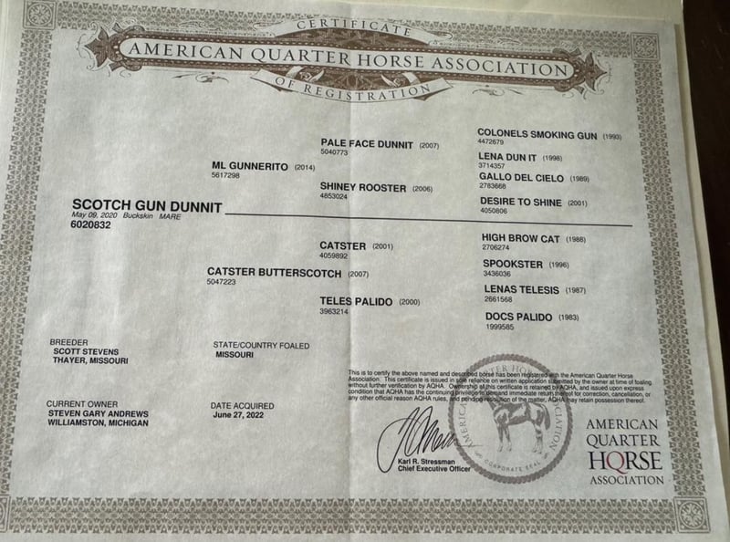ONLINE AUCTION Place your bids at www.PlatinumEquineAuction.com Starting Bid $3500 Auction ends August 4th, 2024 Need a new saddle? Check out White Rock Saddles on our website or Facebook! Scotch Gun Dunnit “Scotch” is 2020 Model, Registered AQHA, Buckskin Mare, standing 14H. Her pedigree is an all-star line-up of horses, going back to Colonels Smoking Gun, Gallo Del Cielo(AKA Rooster), High Brow Cat, Catster and Pale Face Dunnit! She is a naturally athletic western performance horse and has been shown at Foundation Quarter Shows in ranch pleasure, ranch riding, ranch trail, and reining. Scotch is a talented stopper and has a great turnaround. She also loves hitting the trail and maneuvering through the terrain. She has the temperament of a great all around horse. She’s playful and eager yet easy going. Located in Brooklyn, WI. Contact Steve Andrews 571-331-0741 for more info. ONLINE AUCTION Place your bids at www.PlatinumEquineAuction.com Starting Bid $3500 Auction ends August 4th, 2024 Need a new saddle? Check out White Rock Saddles on our website or Facebook!