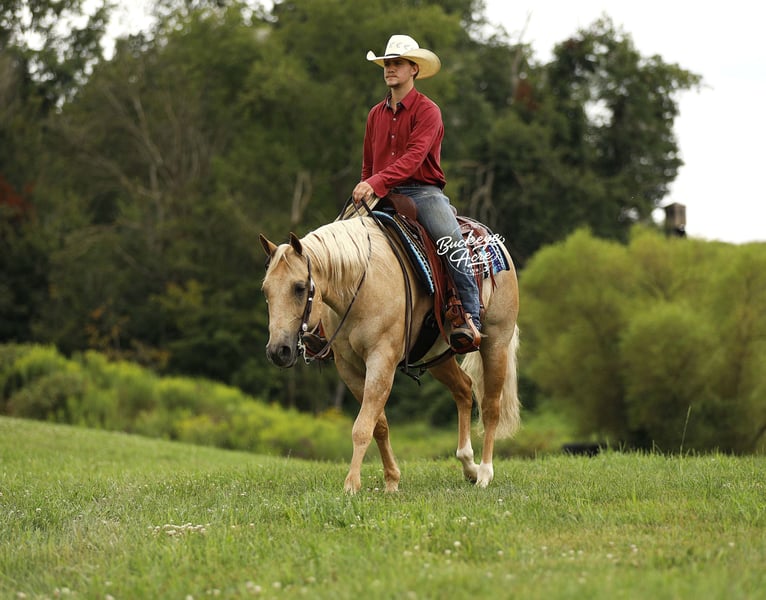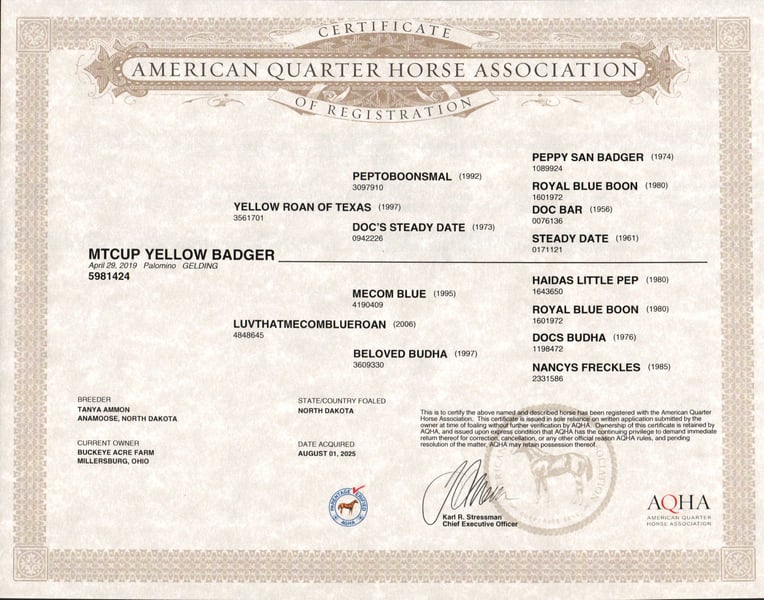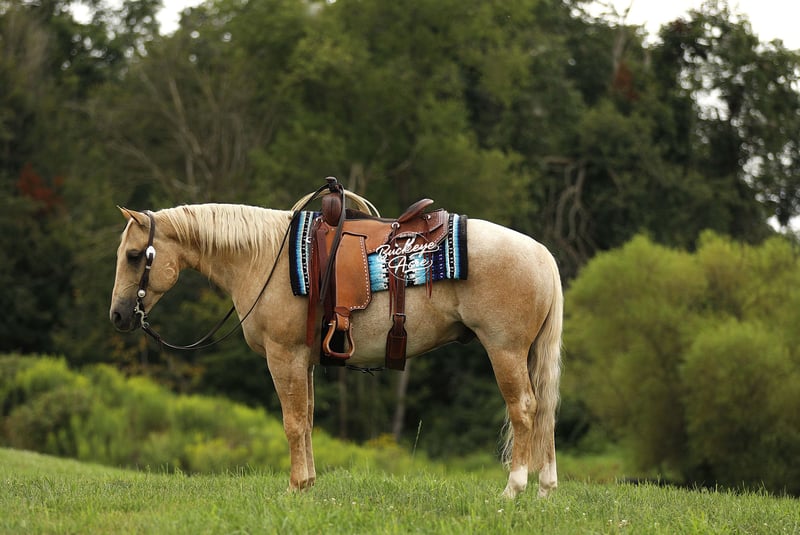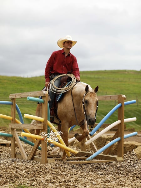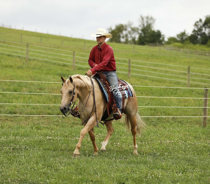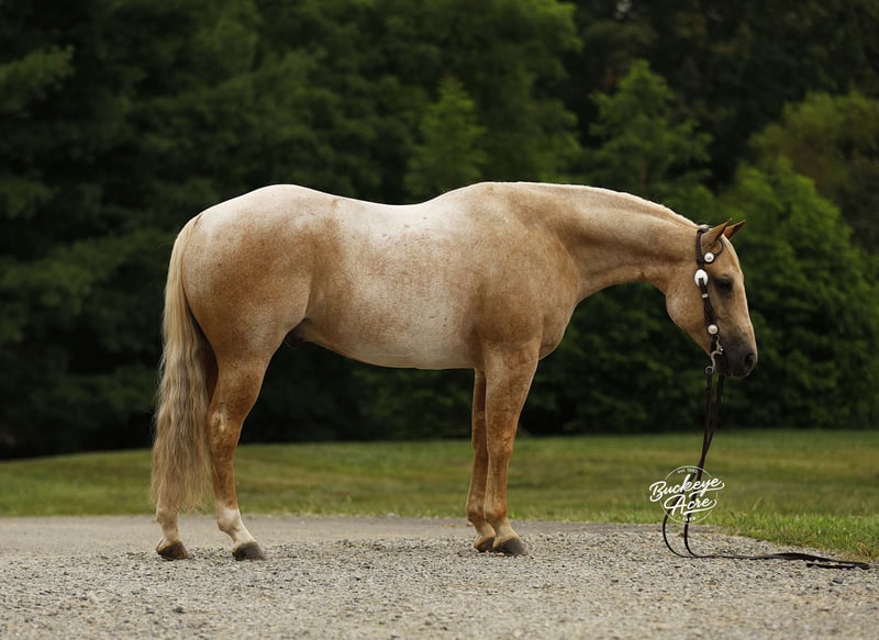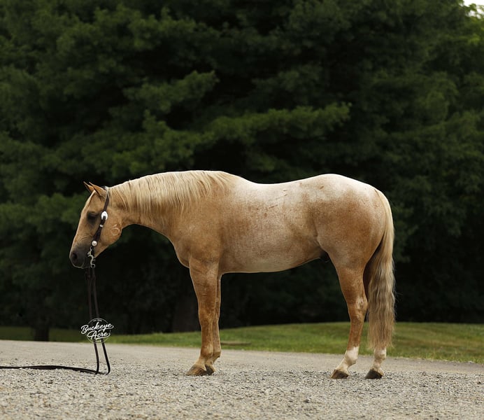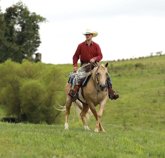Meet Badge, an outstanding individual we are proud to offer! This 2019 model palomino roan gelding standing a strong 14.2 hands tall and is truly the whole package. His rare and striking color is hard to find and guaranteed to draw attention wherever you go—from the arena to the trails and everywhere in between. To top off his good looks, Badge also sports two white socks on his back feet, making him even more eye-catching. We call him Badge because of the unique tattoo-like marking on the side of his cheek—one more feature that makes him one of a kind. Badge has been almost everywhere, and we think he has the talent to go show if you choose. He has been hauled on trails, ridden down state roads, used to check cows, crossed creeks, climbed hills, and stepped over downed logs without hesitation. He has a solid one-hand neck rein, knows his leads, and even offers lead changes. He is confident and reliable with all the “extras” too—comfortable around tarps, jugs, gunfire, and the crack of a whip. Badge especially shines when working cattle, and we believe he has the talent to make your next ranch horse or show partner. His pedigree speaks volumes. Badge is an own son of Yellow Roan of Texas, whose offspring have earned over $500,000, and his papers go back to the legendary Peptoboonsmal, a Hall of Fame sire with over $28 million in progeny earnings. With this kind of breeding, you know he has both the brains and the ability to excel. Under saddle, Badge is smooth and easy to ride, offering a nice walk, jog, extended trot, and a soft lope. He is the kind that does not need to be ridden every day—steady and trustworthy whether he is pulled out once a week or once a month. He is just as good in the barn as he is out in the pasture, stands quietly in the wash bay, and is up to date on dental, farrier, and vaccinations. Safe, versatile, and dependable, Badge is truly suitable for anyone—from beginners to advanced riders, even seniors. Show him one day, then let your kids ride him around the farm the next. Horses that combine this much eye appeal, talent, pedigree, and dependability are few and far between. If Badge sounds like the horse you have been searching for, don’t miss the chance to see him in person. Please feel free to contact Duane at 330-231-2324 for more information or to schedule a day to meet this exceptional gelding.