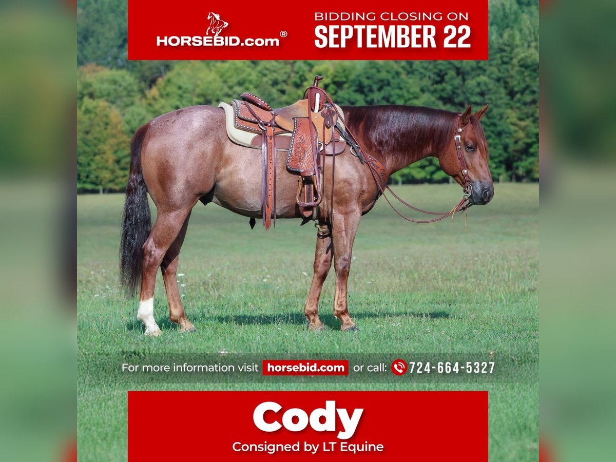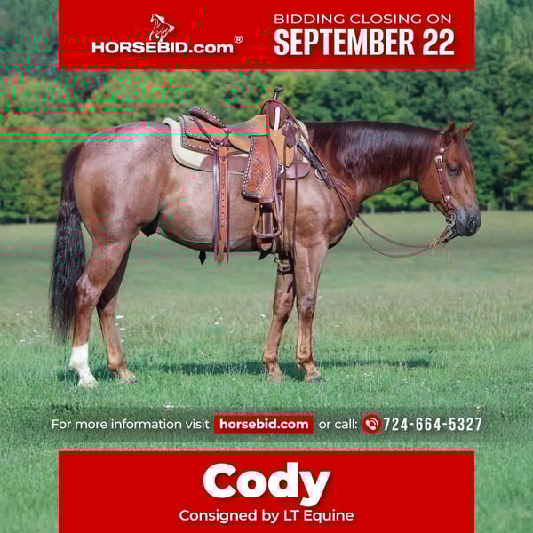 🍁𝒕𝒉𝒆 𝐅𝐀𝐋𝐋 𝑺𝒑𝒆𝒄𝒕𝒂𝒄𝒖𝒍𝒂𝒓🍁 Happening now thru MONDAY | SEPTEMBER 22nd - Available EXCLUSIVELY on HorseBid's website! For more details and to register visit: www.Horsebid.com CONSIGNOR CONTACT: LT Equine 724-664-5327 LOCATION: Miola, PA BREED: AQHA REGISTERED: Yes REGISTERED NAME: Covid Hackberry COLOR: Red Roan HEIGHT: 14.3 AGE: 5 GENDER: Gelding Introducing Covid Hackberry, or as we like to call him Cody. He’s an absolutely outstanding horse that would make anybody happy and will go in any direction you ask him. He is a registered AQHA red roan, he stands approximately 14.3 hands and has a perfect stocky thick build to him with a nice little head and a kind eye, and nice feet. On the ground Cody is an absolutely puppy dog! He is in your pocket style and is always the first to meet you at the gate. He loves attention and is always calm and relaxed. He has great ground manners and a calm demeanor. Cody will pick up all four feet with ease, is great for the farrier, stands great for the vet and to get baths, groom and tack. Cody is an absolute pleasure to ride, whether you’re a beginner or an experienced rider you’ll get along with Cody. He is always relaxed with a level head, not spooky and very willing to do whatever you ask. He has a great one hand neck rein, moves off leg pressure and transitions his gaits perfectly. He will have a nice 360 spin/pivot and a great frame. Cody will side pass, work gates, and is a smooth ride. He is soft in the bridle with a great head set and buttons. Before I got Cody he was a finished rope horse on the heel side. With me I use Cody as a trail horse, we travel all over the place trail riding. He will go out in group or alone. He is steady and willing. I also take Cody to weekend Ranch pleasure and ranch trail shows where he does fantastic. He can be in the pen alone or with 25 other horses and nothing phases him. He keeps a low level head at a loose rein and slow easy jog and a nice loose rein long trot and lope. I really think Cody will be happy in any direction you want to take him wether it be western, English, trail or ranch he’s very versatile and easy to get along with. Cody will be current on his vaccinations, deworming, and coggins test. For any more information on Cody give me a call or text! Thank you and give his video a watch!