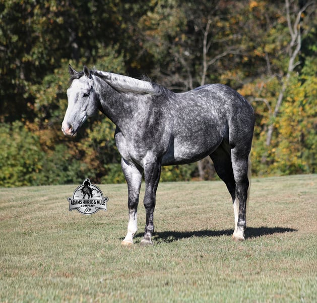He is consigned to the COWGIRL CADILLACS Sale in Wickenburg, AZ on February 20-21st. You can bid online or bid in person. There is a preview day before the sale or you can come ride him prior to the sale in Mt. Vernon, KY. Register to bid at www.CowgirlCadillacs.com More info at www.AdamsHorseAndMuleCo.com $10000 starting bid He’s got dapples the size of apples! SK Drifters Chrome is a 15.2h, dapple grey, 2020 model reg AQHA gelding with a coat that looks as if it is chrome plated! Chrome is a big gentle love bug that is everyone’s best friend! He has never met a stranger and he loves attention and with looks like his… he gets attention everywhere that he goes! Chrome has an excellent pedigree that consists of famous horses such as Sun Frost and Dash TA Fame! Chrome has been ridden around the ranch, he has pasture roped and doctored sick ones. We have hauled Chrome to the rodeos where he has sorted, penned and loaded the bulls. The kids have used him for pony rides and he has been ridden by all ages. The lights, speakers and crowds do not phase him at all! Chrome has been ridden by our kids down the trails, he is safe and not spooky at all! He has carried them over rough terrain, through deep water, deadfall, steep slopes… he is a steady Eddie out on the trails and is very laid back and safe! He has been camping in multiple states from Iowa to Tennessee. Chrome is gentle and easy to ride. He lopes nice circles, reins around both ways, has a good stop and reverse. He has been ridden English and been over the jumps, showing talent in that discipline. Chrome is not spooky around tarps, wind dancers, bull whips and gun fire as well. If you want a horse that is versatile, family safe, experienced, well trained, has a good pedigree… oh and don’t forget pretty… Chrome is the perfect pick for you!!! Chrome is available to ride and see in Mt. Vernon, KY until the week of the sale Feb. 16-21. Call for more info or if you have any questions 606-308-2461. Go to visit our website for more pics and a video www.AdamsHorseAndMuleCo.com AHAMC has been in the horse business and sold horses over the internet since 2005. We have a long track record of success with hundreds of happy customers. We work hard to match riders with the correct horses and specialize in beginner safe, family friendly horses that have been used and checked out by our family! We can set up transportation anywhere in the US and look forward to working with you. He is consigned to the COWGIRL CADILLACS Sale in Wickenburg, AZ on February 20-21st. You can bid online or bid in person. There is a preview day before the sale or you can come ride him prior to the sale in Mt. Vernon, KY. Register to bid at www.CowgirlCadillacs.com More info at www.AdamsHorseAndMuleCo.com $10000 starting bid