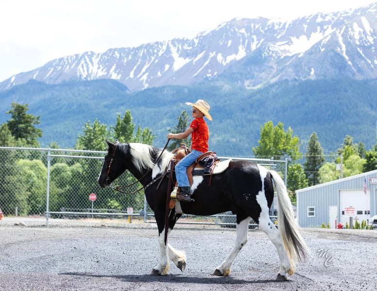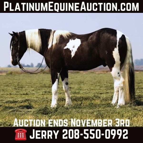 ONLINE AUCTION Place your bids at www.PlatinumEquineAuction.com Starting Bid $3500 Auction ends November 3rd, 2024 Need a new saddle? Check out White Rock Saddles on our website or Facebook! Mack is one cool dude! He is a coming 5 year old(2020 model) Gypsy Draftcross, Gelding that is standing 15.2H and is weighing around 1250lbs. He is pretty as you can make one perfect-sized and GENTLE! Mack rides around like a fancy show horse with the experience of a true ranch horse. He’s had a job outside in tough country pushing cows and doctoring. He lopes around soft and collected or on a loose rein, has good speed control, and will really stop. Mack will spin both ways, side pass with ease and back softly. If safety is a priority then he’s the one. Our ten year old son loves to ride Mack he’s rode around the ranch doing various jobs and even rode him on trail a ride with 60 other horses and through Main Street without a single bobble. Mack is stout built and will travel all day for anyone. Mack is always willing to please and do whatever is asked of him. This is a really nice horse that we’re excited to offer to you. Please call for more info J Arrow Livestock Jerry 208-550-0992. ONLINE AUCTION Place your bids at www.PlatinumEquineAuction.com Starting Bid $3500 Auction ends November 3rd, 2024 Need a new saddle? Check out White Rock Saddles on our website or Facebook!