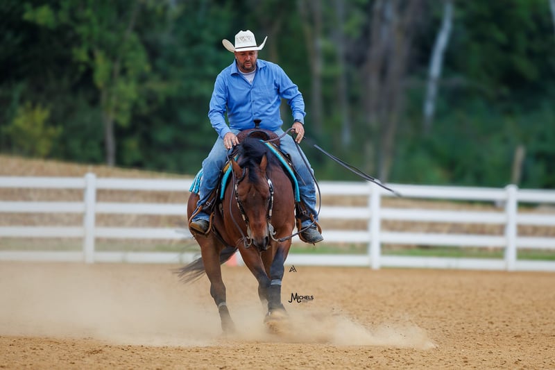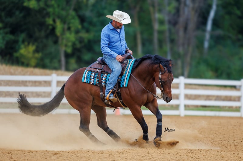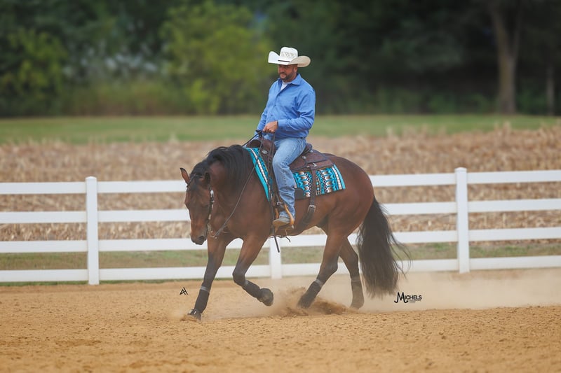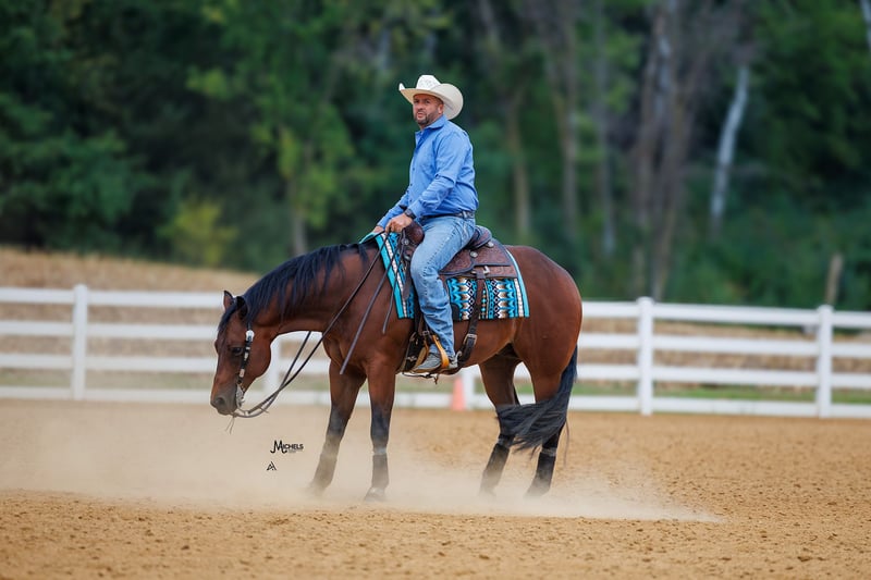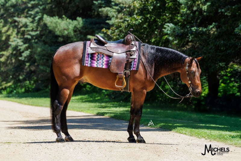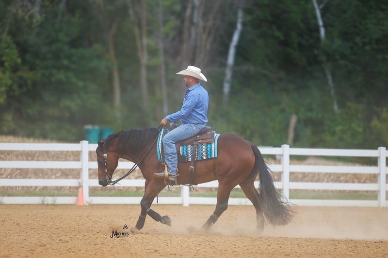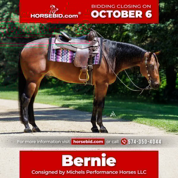 🍂 𝓐𝓾𝓽𝓾𝓶𝓷 𝑨𝑳𝑳 𝑺𝑻𝑨𝑹 𝑳𝑰𝑵𝑬𝑼𝑷 🍂 Happening now thru MONDAY | OCTOBER 6th - Available EXCLUSIVELY on HorseBid's website! For more details and to register visit: www.Horsebid.com CONSIGNOR CONTACT: Michels Performance Horses LLC 574-350-4044 LOCATION: River Falls, WI BREED: AQHA REGISTERED: Yes REGISTERED NAME: Rowdy And Electric COLOR: Bay HEIGHT: 15 AGE: 5 GENDER: Gelding Meet Rowdy And Electric, a 15 hand bay gelding with a heart of gold. Affectionately known as Bernie, this talented horse has made a name for himself in the show ring with $38,573 in NRHA earnings. Bernie is a versatile athlete who has been shown in all levels, showcasing his exceptional skills and adaptability. With his impressive track record and years of derby competition ahead of him, Bernie is a top contender ready to take on any challenge that comes his way. He is incredibly well-bred and has big time names on both sides of his papers. He’s also been a NRHA Level 3/4 Open Futurity Finalist, and in addition to this, Bernie is even a FULL sibling to Mr. Electric Spark (winner of over $160k!) Bernie consistently marks 72-74’s at all the major reining events and is easy to get around the show pen. Bernie an open caliber horse but is gentle enough for the Non Pro divisions and even a more confident rookie rider will enjoy showing him. He is easy to handle and totally used to kids, dogs, chaos, etc. He has a HUGE stop, good set of spins, and a lot of athletic ability to earn credit in all the reining maneuvers. Bernie also is solid outside of the arena and will do excellent for the crossover events like the Ranch Versatility. This gelding is the epitome of a true professional - he has no vices and is a joy to work with in every aspect. Bernie's solid training and natural talent shine through in every performance, making him a standout in the arena. Whether you're a seasoned competitor looking for a reliable partner or a rider eager to learn and grow, Bernie is the perfect match. With his winning attitude and proven success, he is sure to bring joy and pride to his lucky new owner.