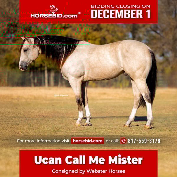 ⚜️ 𝓽𝓱𝓮 𝐇𝐨𝐫𝐬𝐞𝐦𝐚𝐧'𝐬 𝓢𝓱𝓸𝔀𝓬𝓪𝓼𝓮⚜️ Happening now thru MONDAY | DECEMBER 1st - Available EXCLUSIVELY on HorseBid's website! For more details and to register visit: www.Horsebid.com CONSIGNOR CONTACT: Webster Horses 817-559-3178 LOCATION: Decatur, TX BREED: AQHA REGISTERED: Yes REGISTERED NAME: Ucan Call Me Mister COLOR: Buckskin HEIGHT: 15 AGE: 5 GENDER: Gelding Prince is a STUNNING coming 6yo 15hh registered AQHA gelding! You will not find a horse this age as civil as he is. He’s been hauled and seasoned on trails and has been in multiple parades. He has the experience most old horses have at his age. He has years to last as well. He has a correct nice handle on him. Anyone can ride him. Collects and breaks at the poll beautifully at all gates. He has a nice spin/turn around. W/T/C with ease. He will also short lope off. Picks up both his leads great. He is not fast or performance minded. Definitely more woah than go, but not lazy where you have to constantly kick to go. He has a very comfortable and smooth gate. Where he is not performance minded, the best avenue for him if you wanted to do any kind of event would be ranch/trail or obstacle courses. He is so so civil. Leave him off for a month and get right on. He is honest and the same horse every time. He has such a unique look with all 4 high white socks, and his big blaze face, striking dark points on his legs and ears. You could absolutely show him in a halter class as well. He would also be great for anyone just wanting to go down the trail or have a gentle family horse. He will go over/through anything. Just recently ridden through the Vaquero gathering in the down town Fort Worth Stockyards! He’s absolutely healthy in every way, and is super easy to catch and shoe. Stands calm, absolutely no pawing or nickering. He’s perfectly fine to be the only horse you have because he is NOT sour at all. However if you have other horses, he’s good with others too. He loads and unloads easily. This gelding checks all the boxes and would make the best Christmas gift coming up, or get him now that good cool riding weather is here! We will stand behind a 30 day blood test if wanted! Also PPEs are welcome at buyers expense. Please contact Olivia with any questions 817-559-3178. Shipping can be arranged anywhere.