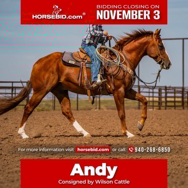 ⚜️𝐓𝐇𝐄 𝐅𝐀𝐋𝐋 𝐇𝐄𝐑𝐈𝐓𝐀𝐆𝐄 𝐂𝐋𝐀𝐒𝐒𝐈𝐂⚜️ Happening now thru MONDAY | NOVEMBER 3rd - Available EXCLUSIVELY on HorseBid's website! For more details and to register visit: www.Horsebid.com CONSIGNOR CONTACT: Wilson Cattle 940-268-6850 LOCATION: Canyon, TX BREED: AQHA REGISTERED: Yes REGISTERED NAME: CR Tuffs Hickory COLOR: Sorrel HEIGHT: 15.1 AGE: 6 GENDER: Gelding Take it from me, everyone needs to own one by Woody Be Tuff (RIATA BUCKLE)! Andy is no exception. This horse is GENTLE, BROKE and EXTREMELY GOOD MINDED! Andy will be gentle every time you catch him. He is a very user friendly type of head horse that will take care of anyone. He will not go to fast, will stay very quite in the box and scores every time. Andy is the kind of head horse that most people need to own. Not only is he very easy in the arena, he is great to ride outside gathering cows or take him out for a Sunday afternoon trail ride. Our 12 year old nephew has used Andy outside as well as he has turned a lot of steers on him in the arena! Andy lopes pretty circles, stops and will turn around with ease! He is the kind of horse that is very enjoyable to ride. Point him in the direction you want to go and he will get you there safely. He will cross all terrain with no issues. There are not very many horses left that were born, raised and branded by the Center Ranch, Andy is one of them! Woody Be Tuff has a lifetime earnings of $351,063. He is the sire of over $13,400,000 in earners. Woody Be Tuff now stands at Solo Select. Horses like Andy are rarely offered for sale, much less publicly listed. Andy is eligible for the following incentives Royal Crown Roping, Riata Buckle, Gold Buckle Futurities, and among others. This horse could pay for himself! Andy stands 15.1 hands tall and will weigh 1200 pounds. Please watch his video and we will let it do the talking for him! We want to personally invite you to come try Andy! We welcome additional prepurchase exams as well. Please call us with any questions. Be on the lookout for videos on social media! 940-268-6850