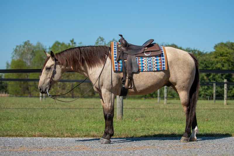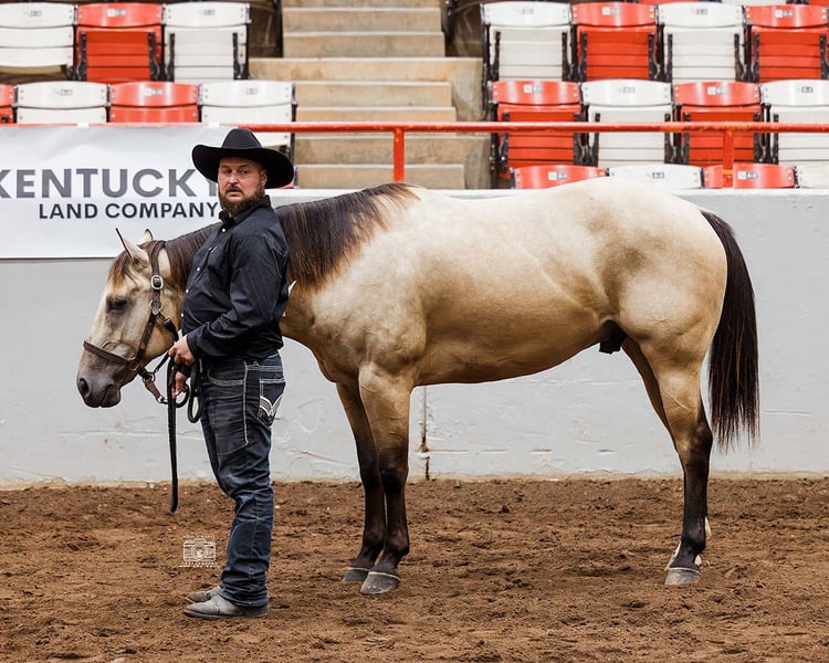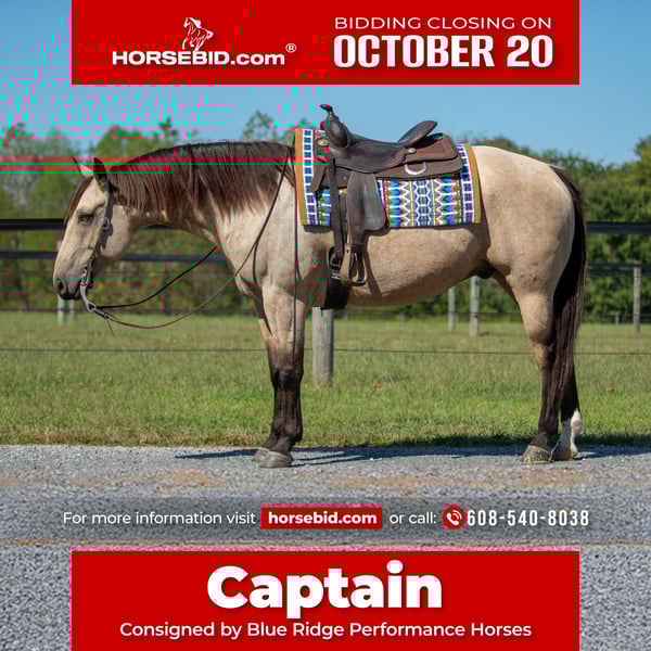 ♦️ 𝐭𝐡𝐞 𝐀𝐌𝐄𝐑𝐈𝐂𝐀𝐍 𝓕𝓪𝓵𝓵 𝓒𝓵𝓪𝓼𝓼𝓲𝓬 ♦️ Happening now thru MONDAY | OCTOBER 20th - Available EXCLUSIVELY on HorseBid's website! For more details and to register visit: www.Horsebid.com CONSIGNOR CONTACT: Blue Ridge Performance Horses 608-540-8038 LOCATION: Mayfield, KY BREED: AQHA REGISTERED: Yes REGISTERED NAME: JT MR DOC BAR ONE COLOR: Buckskin HEIGHT: 15.2 AGE: 5 GENDER: Gelding Introducing Captain, a stunning 5-year-old flashy buckskin gelding with old school breeding going back to the best, such as Tequila Hickory and Doc Bar! Captain has been in professional training for the past 2 years learning the reining maneuvers and ranch riding. He has also been used for giving lessons based off his gentle nature; furthermore, Captain has shown in ranch riding and conformation events with points in his name! Showcasing his solid spin, big stop, and easy changes. Captain is very responsive to subtle cues, moving off your seat with ease. Standing at 15.2h with a LOT OF BODY and BIG BONE, Captain would make an amazing, reliable family trail deluxe / ranch show horse or even a header, having been roped off of in the past. With no bad habits, vices, or blemishes, Captain offers a clean slate for his next rider. Good with farrier, vet, loading and backing out of a trailer, and will stand tied all day. Contact Billi at 608-540-8038 for more information.