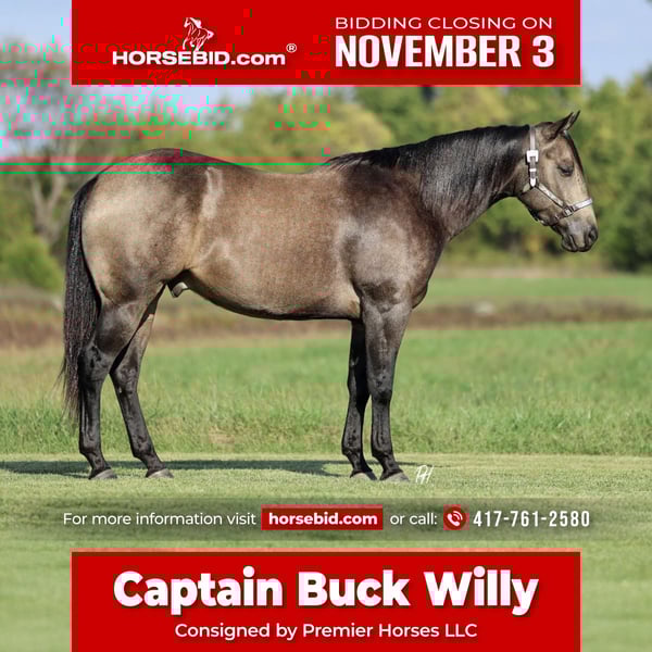 ⚜️𝐓𝐇𝐄 𝐅𝐀𝐋𝐋 𝐇𝐄𝐑𝐈𝐓𝐀𝐆𝐄 𝐂𝐋𝐀𝐒𝐒𝐈𝐂⚜️ Happening now thru MONDAY | NOVEMBER 3rd - Available EXCLUSIVELY on HorseBid's website! For more details and to register visit: www.Horsebid.com CONSIGNOR CONTACT: Premier Horses LLC 417-761-2580 LOCATION: Buffalo, Missouri BREED: Quarter Horse REGISTERED: Yes REGISTERED NAME: Captain Buck Willy COLOR: Buckskin HEIGHT: 15.2 AGE: 5 GENDER: Gelding If you can appreciate a gelding that is tall, dark, and handsome then you will have hit the jackpot if you end up Captain Buck Willy. There is not a whole lot not to like about Shooter, he sports a lot of substance, ride ability, and easy going disposition. He is that stunning sooty buckskin color throughout, the kind everyone stops and stares at. Shooter has plenty of bone, strong feet, big hip, strong shoulder, and the prettiest head to top it off. He is ranch bred through and through, making it easy to see where he gets his looks. He is built to last. Shooter is calm and confident on the trails. He can cover some rough terrain like no one’s business, always staying solid. He goes through shallow creeks or vast rivers with no issues. Shooter is confident traveling down steep and rocky hillsides and will briskly go up one as well. He has been ridden down gravel roads with passing traffic and crossing low water bridges, never wavering. Shooter goes across all of the obstacles we have put in his way and will carry the American Flag, he sure looks good doing it too! He has been used in the pens working cattle all day. Shooter has a nice handle, good ground manners, and a joy to ride. We think he would make a great ranch versatility or rope horse, but if that isn’t your thing he is content toting his next partner down the trails.