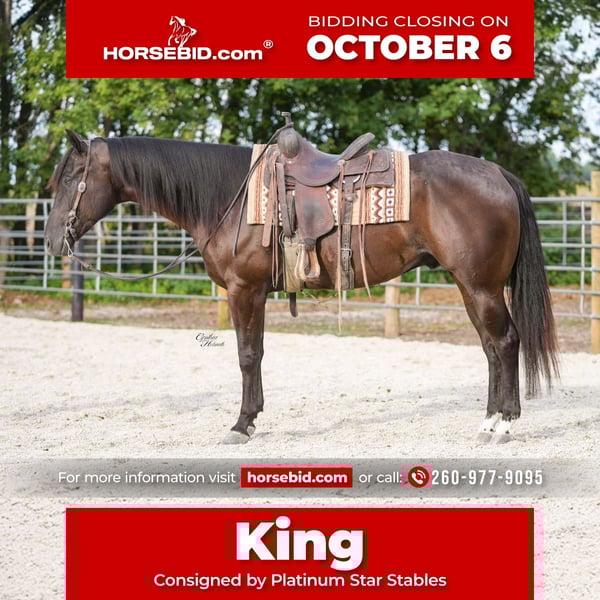 🍂 𝓐𝓾𝓽𝓾𝓶𝓷 𝑨𝑳𝑳 𝑺𝑻𝑨𝑹 𝑳𝑰𝑵𝑬𝑼𝑷 🍂 Happening now thru MONDAY | OCTOBER 6th - Available EXCLUSIVELY on HorseBid's website! For more details and to register visit: www.Horsebid.com CONSIGNOR CONTACT: Platinum Star Stables 260-977-9095 LOCATION: Independence, IA BREED: Quarter horse REGISTERED: Yes REGISTERED NAME: Watching Kings COLOR: Black two hind whites HEIGHT: 15.3 AGE: 5 GENDER: Gelding King is a Registered 5 year old Quarter horse gelding standing 15.3 hands tall that is broke the very best to ride western or English. King has had tons of training in the Arena and also been on trails ,logs ,and obstacles.He will always take every experience you ask for with ease .He neck reins ,pivots , and has a great turn around.king would Excel great in the show arena or even in a Dressage competition. King tacks very good stands to mount and will always walk off gentle. If you ride him once a month or twice a year .You’re more then welcome to come see king at the farm by appointment. Don’t miss out on this handsome Black gelding!! For more Info contact Ervin with Platinum Star Stables at 260 -977-9095