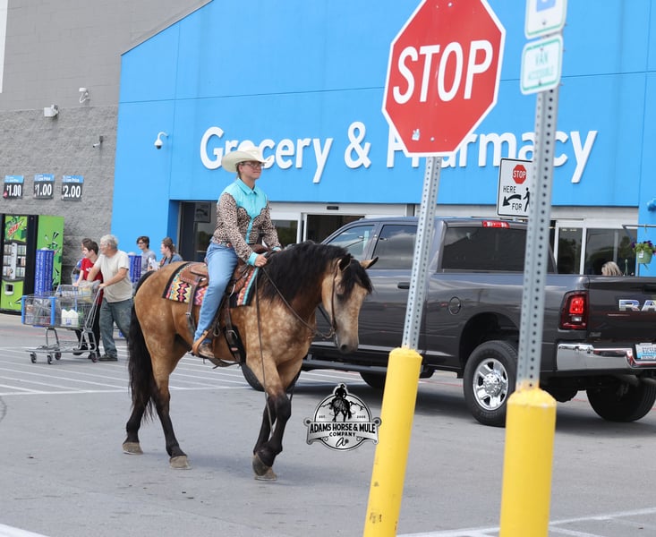 Ariat is consigned to the Best Of The West Horse Sale in Gladstone, NJ on September 26-27th. You can bid online or bid in person. There is a preview day before the sale or you can come ride him prior to the sale in Mt. Vernon, KY. Ariat is a brand that is comfortable, built to last and looks nice… just like the boots this Ariat is much the same! He is one classy looking guy! Not only does he look cool, he has all of the other boxes checked as well… he is Mr. Personality, as friendly as they come, loves attention and is very calm natured. From standing patiently for the kids to braid him to getting scrubbed from head to tail in the washbay, Ariat loves every moment with his people. Ariat has been ridden by every member of our family all the way down to our 7 year old. He is the type of horse that will take care of your grandma, the kids or random guests that show up. Ariat has been ridden down the highways, we have had in town and even though the bank drive-thru and he is traffic safe. He is a nice mover as he has a smooth trot, a VERY VERY nice easy to set lope, a good stop, turns a circle both ways and backs with ease! Ariat is great on trails and he will cross creeks, ditches, logs and navigate rough rocky areas. He has been exposed to all kinds of wildlife such as deer or turkey and will go anywhere that he is asked too. He has been ridden many miles in the mountains and encountered every obstacle possible on the trail. He has carried the kids up or down even the steepest slopes, across deep creeks, over downed trees, and over all types of rough terrain while still being sure footed. He has been ridden around cattle and used a couple of brandings to drag calves. Ariat also rides English and is talented at going over the jumps. He is steady coming into them, careful when landing and shows great form. In addition to riding, Ariat has been driven down the highways and worked on the farm as well. If you need a horse that can do anything from ranch work to trails, that can go over the rails or just hook up in a cart and go for a Sunday afternoon stroll through town… this is a horse that your family will cherish for years to come! Call 606-308-2461 with any questions.