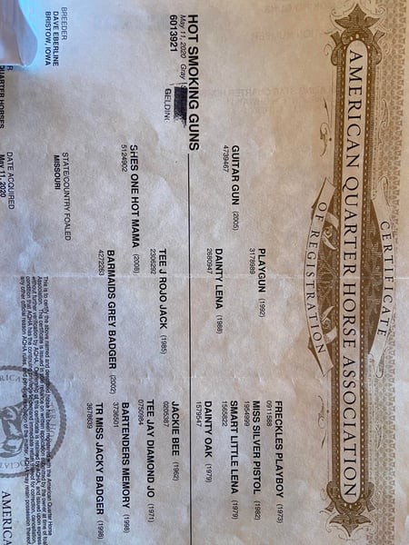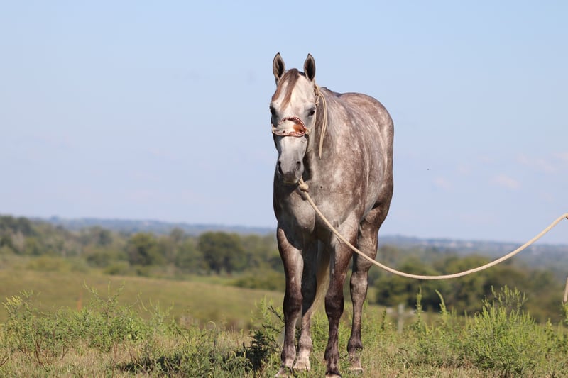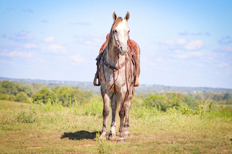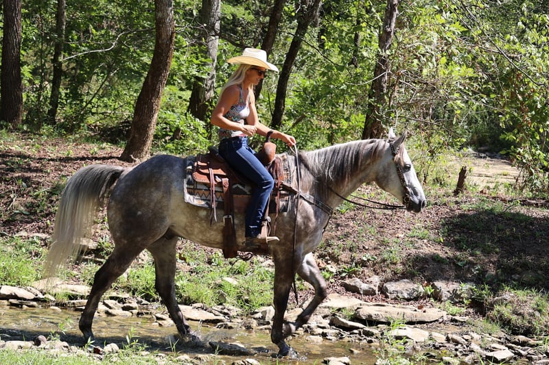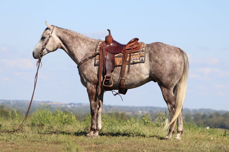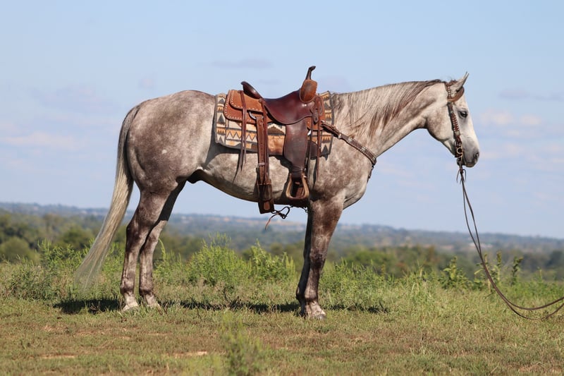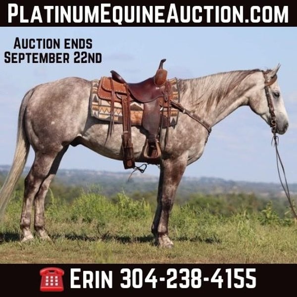 ONLINE AUCTION Place your bids at www.PlatinumEquineAuction.com Starting Bid $3500 Auction ends September 22nd, 2024 Need a new saddle? Check out White Rock Saddles on our website or Facebook! This is “HOT SMOKING GUNS” an incredibly nice AQHA registered dapple gray gelding. He is quiet minded and professionally trained. He is broke right and rides nicely in and out of the arena. He is started roping nicely and been out of the box on the head side. He has been trail ridden by novice riders at the state parks and open shows. He will move off of leg cues, side pass, one step lope, catch his leads, slide stop, and back up. He will bend and flex nicely and is soft in the bridle. He will break at the poll and give his face quietly. He will cross water, cautiously travel over rough and steep terrain, and go where he is pointed without hesitation. He has a nice easy turnaround and a true one hand neck rein. This gelding stands 16 hands tall and is 4 years old. He is royally bred and is a grandson of PLAYGUN. He also has greats such as FRECKLES PLAYBOY, JACKIE BEE, & SMART LITTLE LENA on his papers. He is a home raised, professionally trained, super intelligent very nice young 4 year old that is gentle, civilized, and has excellent manners. Don’t miss out if you want a great trail, ranch, rope, or performance horse. Located in Flemingsburg, KY. Contact HH Horses Erin 304-238-4155. ONLINE AUCTION Place your bids at www.PlatinumEquineAuction.com Starting Bid $3500 Auction ends September 22nd, 2024 Need a new saddle? Check out White Rock Saddles on our website or Facebook!