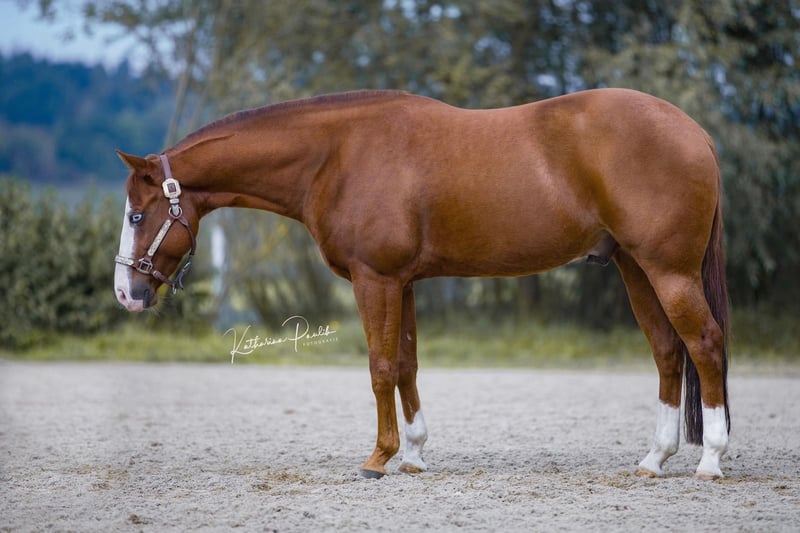 AK Gun Special Whiz ("Wally") ist ein im März 2019 geborener Quarter Horse Wallach in der Farbe Sorrel mit einem Stockmaß von ca. 146 cm. Er ist korrekt gebaut, gut entwickelt und besitzt kompakte, harmonische Proportionen. Optisch wie charakterlich überzeugt er auf ganzer Linie. Wally ist ein sehr lieber, menschenbezogener und aufgeschlossener Wallach, der den Kontakt zum Menschen genießt. Er ist ein echter Schmusebär, freundlich, brav, lernwillig und angenehm im Umgang. Besonders geeignet ist er für Reiter, die Wert auf ruhige, harmonische Stunden im Sattel eines gut ausgebildeten Pferdes legen. Der Wallach verfügt über eine sehr gute Westernausbildung mit Galoppwechseln und Seitengängen etc.. Auch Gelände kennt er, benötigt dort jedoch noch etwas mehr Routine. Aufgrund seiner sehr guten Reining-Abstammung bringt er viel Qualität mit, soll jedoch nicht mehr im Reining-Sport oder mit Reining-Elementen eingesetzt werden und wird ausdrücklich nur als Freizeitpferd abgegeben. Wally ist sehr verträglich, kennt Offenstall, Paddockbox und Box und läuft zur Zeit barhuf. Er ist regelmäßig beim Hufschmied, geimpft und entwurmt. Sein 5-Panel-Test ist n/n. Im Jahr 2023 hatte er einen Griffelbeinbruch, im April 2025 einen oberflächlichen Schaden am Fesselträger. Beide Verletzungen sind ausgeheilt. Seit September 2025 wird er wieder normal geritten. Papiere der American Quarter Horse Association (AQHA) sowie ein Equidenpass liegen vor. Ursprünglich sollte Wally als Gesellschaft für eine Stute dienen, leider mag die Stute ihn überhaupt nicht. Daher sucht er nun wieder ein passendes, liebevolles Zuhause. Gesucht wird ein Platz bei Menschen, die ihm Zeit, Zuwendung und Wertschätzung schenken und ein zuverlässiges, gut ausgebildetes Freizeitpferd zu schätzen wissen. Da es am wichtigsten ist, das er in ein gutes Zuhause zieht, gilt bei ihm Platz vor Preis.