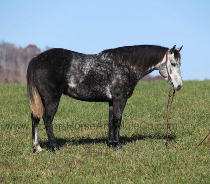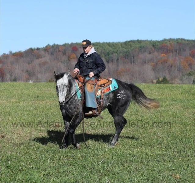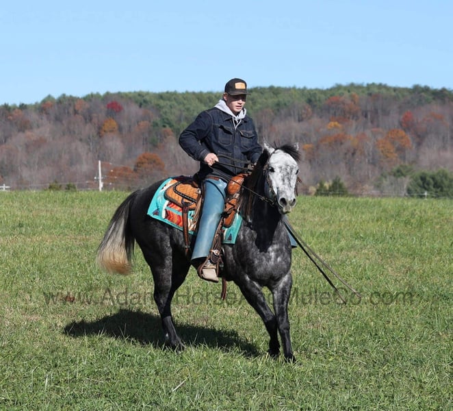 Go to visit our website for more pics and a video. AHAMC has been in the horse business and sold horses over the internet since 2005. We have a long track record of success with hundreds of happy customers. We work hard to match riders with the correct horses and specialize in beginner safe, family friendly horses that have been used and checked out by our family! We can set up transportation anywhere in the US and look forward to working with you.Jak Mr Val Star 585 aka Val is a beautiful Dapple Grey that is very stout built, standing 14.3hh and he is a 2019 Model Registered AQHA Gelding! We have had a lot of these “Jak” horses that are bred and raised on the Oleen Brothers Ranch out in Kansas and every one of them that we have had are always gentle, good minded horses that are great for trails and ranch work. Val is no exception to that trend! He is a gentle type of horse that is never in a hurry! He lopes nice circles, catches the correct leads, has a good stop and reins around. Val just eases along down the trail and loves going on trail rides. He will cross creeks, ditches, logs and navigate rough rocky areas. Val has been exposed to all kinds of wildlife and will go anywhere that he is asked too. He has been rode many miles in the mountains and encountered every obstacle possible on the trail. He will go up or down even the steepest slopes, across deep creeks, over downed trees, and over all types of rough terrain while still being sure footed. Val has been ridden down the highways and is traffic safe as well. Val has been used around the ranch, he has sorted, penned and pasture roped. If you need a broke, quiet, gentle, safe horse for ranch or trails… Val is your guy! Call Eric 606-308-2461 with any questions.Go to visit our website for more pics and a video. AHAMC has been in the horse business and sold horses over the internet since 2005. We have a long track record of success with hundreds of happy customers. We work hard to match riders with the correct horses and specialize in beginner safe, family friendly horses that have been used and checked out by our family! We can set up transportation anywhere in the US and look forward to working with you.