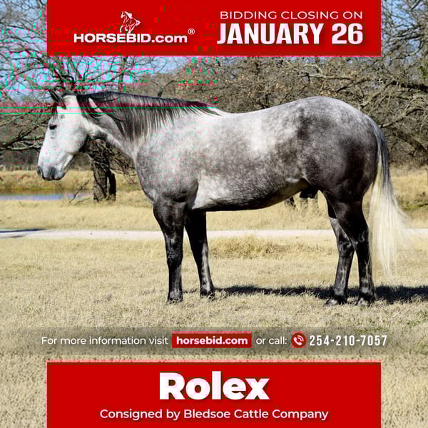 𝐉𝐀𝐍𝐔𝐀𝐑𝐘 ⭐️𝑨𝒍𝒍 𝑺𝒕𝒂𝒓 𝑳𝒊𝒏𝒆𝒖𝒑⭐️ Happening now thru MONDAY | JANUARY 26th - Available EXCLUSIVELY on HorseBid's website! For more details and to register visit: www.Horsebid.com CONSIGNOR CONTACT: Bledsoe cattle company 254-210-7057 LOCATION: Gordon, TX BREED: Qh REGISTERED: Yes REGISTERED NAME: Mr lucky beggar COLOR: Grey HEIGHT: 14.3 AGE: 7 GENDER: Gelding MR lucky beggar Rolex is a seven year old registered gelding with all the look and eye appeal one could want. He has plenty of size for any job at hand. Rolex is well versed in all aspects of not only ranch work but multiple disciplines in the arena as well. He is confident and sure footed on the trails, go with a group or on your own and you are going to enjoy your ride. When it comes to ranch work he is ready for any job, used sorting pens all the way to doctoring cattle out in the open he is one you can trust to get you through the work day. Can’t forget when the work day is done and your are ready to have some fun, he is also a finished head and heel horse. Rolex has been to jackpots on both ends and is ready to take you to the pay window. He is lightly started in the breakaway and would not take much to finish out. Rolex is very kind natured and wants to please. This horse has never offered to buck or kick. He is not one to spook or get worked. He is alert on the ground and aware of his surroundings but settles in quickly. His right ear has a split from previous mishap as a young horse and can be sensitive to you touching it at times. Sells with a current lameness exam as well as x-rays. Stands at 14.3 weighing approximately 1,300 pounds.