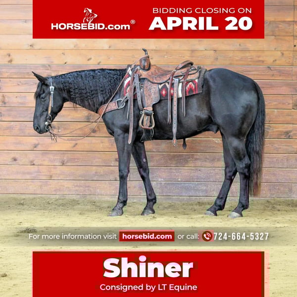 ⚜️𝐭𝐡𝐞 𝓔𝓵𝓲𝓽𝓮 𝐒𝐩𝐫𝐢𝐧𝐠 𝐂𝐥𝐚𝐬𝐬𝐢𝐜⚜️ Happening now thru MONDAY | APRIL 20th - Available EXCLUSIVELY on HorseBid's website! For more details and to register visit: www.Horsebid.com CONSIGNOR CONTACT: LT Equine 724-664-5327 LOCATION: Miola, PA BREED: AQHA REGISTERED: Yes REGISTERED NAME: Shining Sak Em San COLOR: Black HEIGHT: 15.1 AGE: 7 GENDER: Gelding Shining Sak Em San, affectionately known as “Shiner,” is a striking black AQHA registered gelding whose lineage traces back to the great Shining Spark. Coming 7 years old and standing just over 15.1 hands, Shiner is the kind of horse that is a blessing to have around. Shiner is truly one of the nicest trail horses I’ve had the pleasure to own and ride. Whether heading out alone or in a group, he is steady, willing, and confident. He is the same horse whether he’s leading the pack or quietly following along behind. Shiner navigates water crossings, rocky terrain, and uneven ground with ease, always maintaining a comfortable and sure-footed cadence. He has been my go-to horse for both myself and guests, the kind you can rely on to take care of his rider. In the arena, Shiner is just as enjoyable. He carries a nice neck rein, moves willingly off leg pressure, and stays soft in the bridle with a collected headset. His trot is smooth and easy to sit, and he has a slow, comfortable one-step lope that makes him a pleasure for any rider. He has also been exposed to cattle work, adding to his versatility. Shiner is beginner-friendly while still being enjoyable and responsive for more experienced riders. He is the same dependable horse whether ridden daily or given time off—he does not require constant riding to stay gentle and honest. On the ground, Shiner is as kind as they come. He has excellent manners, stands quietly tied, and is easy to catch. He is relaxed in a stall, gets along well with pasture mates, and handles all the basics with ease—bathing, grooming, saddling, and bridling. He picks up all four feet without issue, loads and hauls quietly, easy to work with and have around. Shiner sells with a current health exam, fresh coggins. If you’re looking for a kind, honest gelding that you can trust to take care of you on the trail and enjoy in the arena, Shiner is one you won’t want to miss.