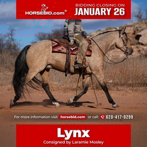 𝐉𝐀𝐍𝐔𝐀𝐑𝐘 ⭐️𝑨𝒍𝒍 𝑺𝒕𝒂𝒓 𝑳𝒊𝒏𝒆𝒖𝒑⭐️ Happening now thru MONDAY | JANUARY 26th - Available EXCLUSIVELY on HorseBid's website! For more details and to register visit: www.Horsebid.com CONSIGNOR CONTACT: Laramie Mosley 620-417-0299 LOCATION: Canyon, TX BREED: Quarter REGISTERED: No COLOR: Buckskin HEIGHT: 15.1 AGE: 7 GENDER: Geldingv