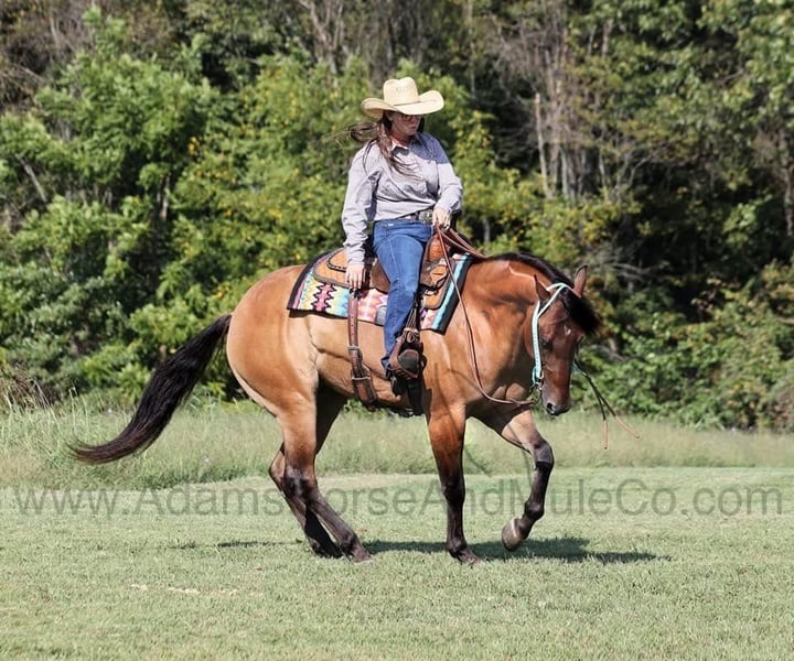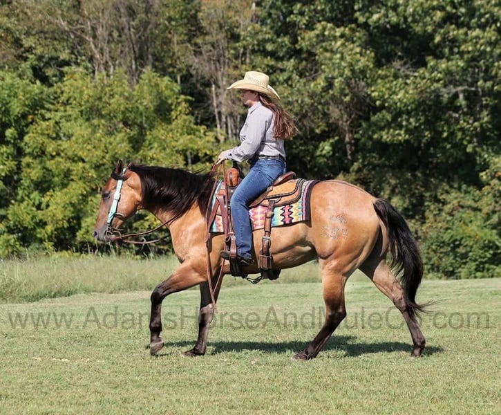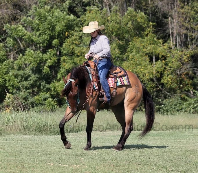 Jak is consigned to the Cowgirls Cadillacs sale in Wickenburg, AZ on February 21-22, 2025. Make plans to attend, you can bid in person or bid online. You can preview any horse in Mt. Vernon, KY before they head to Wickenburg, AZ or preview them when they arrive at the sale. Shipping can be arranged to any state or Canada. You can get more info about the sale at www.CowgirlCadillacs.com THESE Horses ARE NOT AVALAIBLE FOR PRIVATE PURCHASE If you have big dreams and ambitions of doing cowgirl work out on the ranch or maybe just moseying along down the trails or even competing in a Ranch Show Class and need that special partner that is automatic… One that knows what to do, maybe even if you don’t??? Well if that sounds like you, Jak Mr Blue Poco 554 needs to be walking through your barn door! Poco is a well built 15.1hh, 2019 model, registered AQHA, Dun (with buckskin shades) Gelding. He is one of the friendliest horses that you will find and he loves attention! Poco is a horse for all jobs, anything on the ranch from sorting to pasture roping, to trails up in the rugged mountains, put him in the ranch classes or back him in the box and collect a check… he will do it all and do it all- RIGHT! He handles all terrains on the trails, from steep slopes to rough rocky areas, Poco has safely carried our girls through some rough spots! In addition to the kids trail riding him, we have also used him at the stockyards penning cattle and he has worked on a feedlot as well. Poco is a super gentle, laid back type of horse that is gentle enough for all levels of riders! He has a smooth jog, takes his leads in a nice slow lope and slide stops. Poco is one hand broke, he spins both ways, sidepasses to open/shut gates and backs with ease. He has been exposed to all kinds of wildlife and works well with stock dogs. He is the same horse whether ridden daily or even if he is left in the pasture for an extended period of time. He has no vices, we trust him 100% and we feel like he will be the perfect addition to anyone’s family! Call 606-308-2461 for more info.