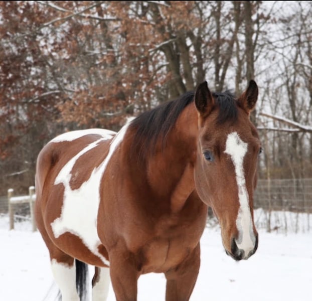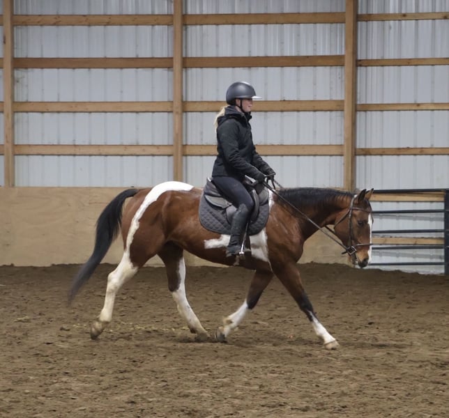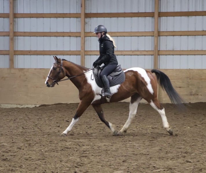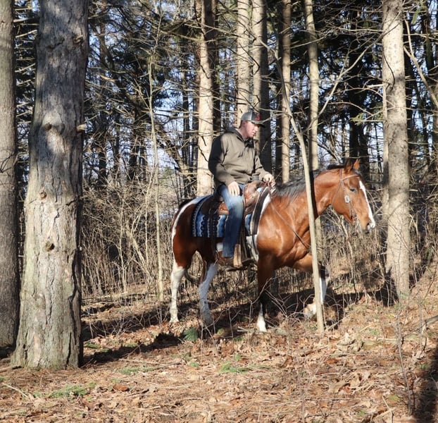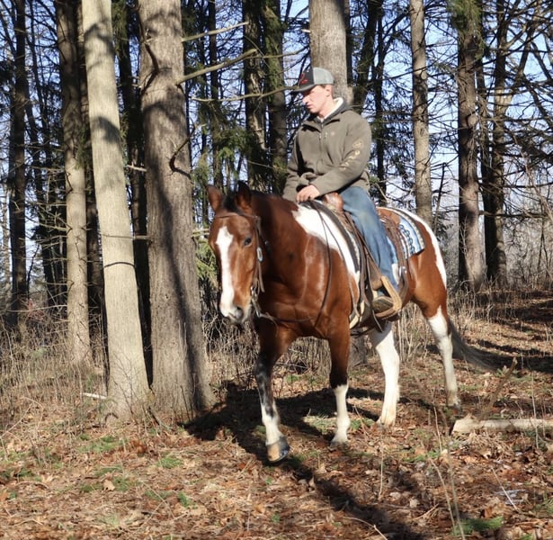 Meet Wesley! Talk about a flashy guy! He stands a sturdy 15.1hh at 7 years old. Wesley is a beautifully marked tri-colored paint gelding. He is very polite on the ground. He stands tied, stands for a bath, stands to be groomed and tacked. He has spent much of his life on the trails just being a laid back trail horse. With that being said he's well traveled and not reactive. Wesley has seen woods, water and wildlife. He's been down back roads and thru open fields. He's always game to go on an adventure. He will gladly take the lead but will also follow along. He rides out alone as well. He is a very simple cluck to go and pull to stop kind of ride. His gaits are so comfortable you may think you're sitting on a cloud! Recently Wesley has been started on some more formal arena work and is progressing very well. He is eager to learn and has a willing demeanor. With some finishing touches he could clean up in the show ring! He is a best-friend type of guy looking