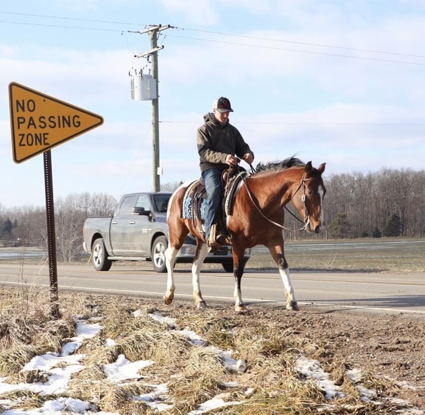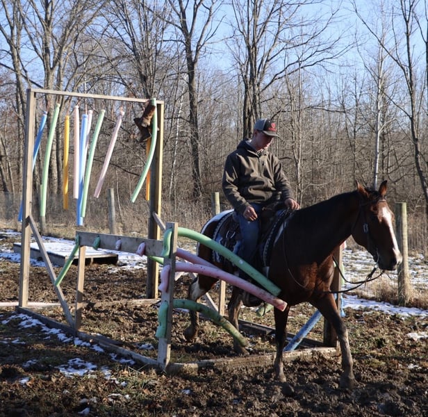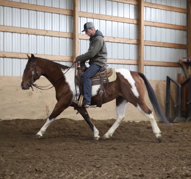 Lernen Sie Wesley kennen! Ein echter Blickfang! Er ist ein kräftiger, 15,1 hh großer Quarter Horse-Gelding im Alter von 7 Jahren. Wesley ist ein wunderschön markierter Tricolour Paint. Er ist sehr freundlich im Umgang. Er steht ruhig angebunden, lässt sich für ein Bad, zum Putzen und Satteln problemlos festhalten. Den Großteil seines Lebens hat er als entspannter Trailpartner verbracht. Er ist gut unterwegs, reagiert nicht übermäßig auf Umweltreize. Wesley hat Wald, Wasser und Wildtiere gesehen. Er war auf Nebenstraßen unterwegs und durch offene Felder. Er ist immer bereit für ein Abenteuer. Er übernimmt gern die Führung, folgt aber auch gerne hinterher. Er kann auch alleine geritten werden. Sein Ride ist sehr einfach: Ein kurzer Klick und ein Ziehen zum Anhalten genügen. Seine Gänge sind so bequem, dass man meinen könnte, auf einer Wolke zu sitzen! Kürzlich wurde Wesley in formale Arena-Arbeit eingearbeitet und macht große Fortschritte. Er ist lernwillig und zeigt eine freundliche Einstellung. Mit ein wenig Feinschliff könnte er im Showring glänzen! Er ist der perfekte Partner für einen Freund, der mit ihm die Trails erkunden oder die Arena weiter trainieren möchte!
