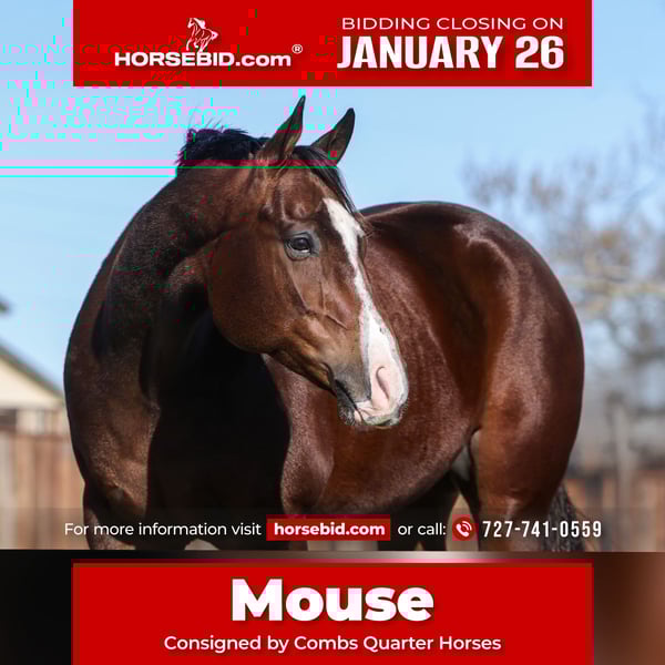 𝐉𝐀𝐍𝐔𝐀𝐑𝐘 ⭐️𝑨𝒍𝒍 𝑺𝒕𝒂𝒓 𝑳𝒊𝒏𝒆𝒖𝒑⭐️ Happening now thru MONDAY | JANUARY 26th - Available EXCLUSIVELY on HorseBid's website! For more details and to register visit: www.Horsebid.com CONSIGNOR CONTACT: Combs Quarter Horses 727-741-0559 LOCATION: Cleburne, TX BREED: AQHA REGISTERED: Yes REGISTERED NAME: Lopin Witha Cocktail aka Mouse COLOR: Bay HEIGHT: 15.2 AGE: 7 GENDER: Gelding Here is a real show horse you can truly show and trail ride! Lopin Witha Cocktail (Lopin My Best x Custom Ride) “Mouse” is a stunning 7yr old 15.2h bay gelding by the multiple champion producing Lopin My Best and out of an own daughter of the superior sire, Radical Rodder! From the AQHA to the local shows to the trail rides.. this guy will keep you in the spotlight! DISPOSITION: Mouse is the definition of a love bug! He will leave his food and his friends just to get a kiss on the muzzle! Needless to say he’s easy to catch! He’s got such a cool, fun loving personality you’ll just adore! He’s absolutely perfect to wash and loves to be groomed and doted over. Mouse is well suited for all ages and sizes. From the lesson barns to the trail riding homes.. I think everyone will enjoy this sweet boy! WESTERN EXPERIENCE: Mouse has been trained in the western pleasure with show miles in the western pleasure as well as the ranch pleasure. Although Mouse looks great doing the western pleasure.. he really shines in the ranch pleasure classes with his perfect jog and the most amazing lope! He responds very well to his riders leg and seat but not overly sensitive to frustrate the less experienced riders. Mouse is also a wonderful young man to have out on the trails. He’s not spooky or silly acting at all. He doesn’t mind going over, under or through any trail obstacles. He even loves playing in the water! For the trail riders with the bad backs.. this guy is like riding a comfy couch in style! ENGLISH EXPERIENCE: Mouse is just starting his English career and showing a lot of promise as a possible future hunter! He’s a natural on the flat and he’s really liking the jumping along with showing great form! He’d be one that would be hard to beat in the flat classes for sure! UPKEEP: Mouse is currently eating free choice alfalfa and 1 1/2 scoops twice a day of a basic pellet. No supplements or maintenance required to keep this guy sound! We do have Mouse in front shoes just as a personal preference. TURNOUT: Mouse is quiet in a group turnout or single turnout. He’s not aggressive and doesn’t go looking for a fight! He’s happy playing and loving life! GROUND MANNERS: Mouse has excellent ground manners! He will also do the showmanship so he’s well aware of personal space and staying out of it! Even the little ones can lead him around without fear of smooshed toes! Mouse is a gentleman about washing, grooming, saddling, bridling and standing at a mounting block! He also stands single tied and cross-tied. BAD HABITS/ VICES: Mouse has no bad habits or vices. No bite, buck, rear, bolt or kick. TACK: Mouse rides English, western or bareback. He will ride around in a halter and lead rope, a plain snaffle or even a port bit. He’s not fussy or picky.