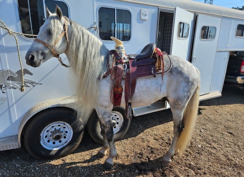 ONLINE AUCTION Place your bids at www.PlatinumEquineAuction.com Starting Bid $3500 Auction ends August 17th, 2025 Need a new saddle? Check out White Rock Saddles on our website or Facebook Topo is a beautiful 6 year old 15.2h, Quarter Horse Cross stallion that is a Stunning dapple gray color with a long mane and tail. He has excellent conformation and strong, athletic build. He is gentle and respectful on the ground. Ties, leads, stands for grooming and farrier. He is great for parades,shows,partys and other events,potential for ranch work, trail, or breeding. Sound, healthy, and well cared for, up to date on vaccinations, worming, and shoes. Locatd in Alhambra, CA. Contact Carlos Perez 562-456-7730 with any questions. ONLINE AUCTION Place your bids at www.PlatinumEquineAuction.com Starting Bid $3500 Auction ends August 17th, 2025 Need a new saddle? Check out White Rock Saddles on our website or Facebook
