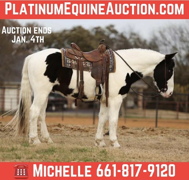 ONLINE AUCTION Place your bids at www.PlatinumEquineAuction.com Starting Bid $3500 Auction ends January 4th, 2025 Need a new saddle? Check out White Rock Saddles on our website or Facebook Elite Looks. Elite Mind. Elite Versatility. Introducing Duke — a 7-year-old Gypsy cross paint gelding standing a solid 15.0 hands, and the kind of horse that rarely comes available. Striking, one-of-a-kind looks paired with a flowing mane and tail make him impossible to overlook, but it’s his mind and talent that truly set him apart. Duke is exceptionally kind, quiet, and willing, with a natural desire to please. He’s been a dependable ranch partner—checking cattle, horses, and fences—and has countless miles outside. He’s a confident point-and-go gelding that rides out alone or in a group, willingly leaves the herd, and stays steady no matter the job or setting. This gelding is as seasoned as they come. He’s sure-footed in the roughest terrain, confidently crosses creeks, rivers, bridges, logs, brush, and obstacles without hesitation. Duke has been ridden extensively in traffic and proved himself beyond his years during his first trip to the Fort Worth Stockyards on a busy Friday, taking crowds, carriages, loud music, and heavy traffic completely in stride. Used weekly at the sale barn, Duke excels at penning back cattle, sorting, and loading trucks. He understands a full day’s work and handles it with a great attitude every time. In the arena, he’s soft in the bridle, naturally low-headed, stylish, and correct, with smooth transitions at the walk, trot, and lope. He’s refined enough to go English and stand out just as easily as he shines in Western tack. Duke approaches every new experience with quiet confidence and maturity. He’s the kind of gelding that elevates any program—equally suited for ranch work, trail riding, town, arena work, or simply owning something truly special. Class, talent, and temperament all in one exceptional package. Horses like Duke are few and far between. We are open to anyone interested in him to schedule a time to come see him or if you can’t make it schedule a FaceTime showing to see him. If you need help with transport don’t hesitate to ask we have a list of reputable haulers that can get him safely to your doorstep WORLD WIDE including, Alaska , Mexico, Hawaii, Canada and anywhere in between from Stephenville, TX. For more info contact Michelle with M $ Performance Horses 661-817-9120 ONLINE AUCTION Place your bids at www.PlatinumEquineAuction.com Starting Bid $3500 Auction ends January 4th, 2025 Need a new saddle? Check out White Rock Saddles on our website or Facebook