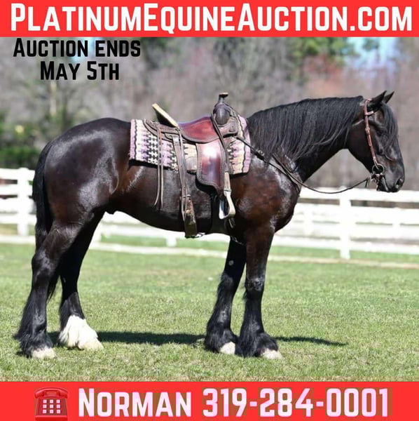 ONLINE AUCTION Place your bids at www.PlatinumEquineAuction.com Starting Bid $3500 Auction ends May 4th, 2025 Need a new saddle? Check out White Rock Saddles on our website or Facebook! Meet Louis Boy! He is a 16.1h, Draftcross Gelding, that is 6 years old and very well built. He is a total dream to have around the barn, he loves attention and will come right up to anyone! He is an absolute barn a favorite! If you are looking for tall, dark and handsome, he is your guy! Louis is broke to ride western, english and even bareback and drives single and double. He is easy to catch, saddle, groom, shoe and bathe. We have had him every where that you can think of and he is always rock solid! From driving/riding through town, to going down the highways, throught the trails, water, logs… he does it all! He will walk, trot and canter nice circles. He neckreins, knows leg pressure and takes his leads. He even rides bridleless and does tricks! He is updated on coggins, worming, shoeing, and has a rabies vaccination. he sells sound and with no bad habits! For more info call Silver Star Stables Norman 319-284-0001 or come see him in Sturgis, MI. ONLINE AUCTION Place your bids at www.PlatinumEquineAuction.com Starting Bid $3500 Auction ends May 4th, 2025 Need a new saddle? Check out White Rock Saddles on our website or Facebook!