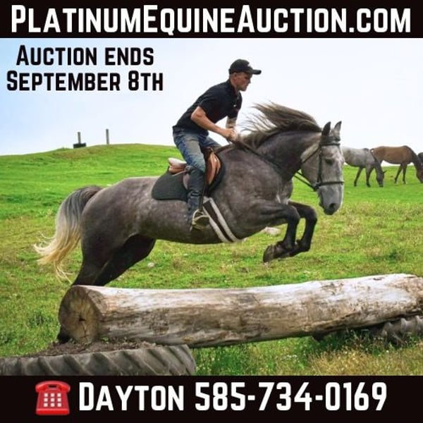 ONLINE AUCTION Place your bids at www.PlatinumEquineAuction.com Starting Bid $3500 Auction ends September 8th, 2024 Need a new saddle? Check out White Rock Saddles on our website or Facebook! Oreo is a 5-year-old Percheron/ Quarter Horse cross gelding standing 16h tall and weighing roughly 1400 pounds. He has a nice walk, trot, canter, backs, yields his hindquarters, stops off your seat, side passes, and spins. We have used Oreo for various events on the farm, such as trail rides, lessons, driving, and our obstacle course; he does it all. Oreo has many miles out on the trail and in the arena. He will lope a nice circle in the arena and then ride alone or with a group and cross water, logs, and ditches with no problem. Oreo is not only great at riding, but he also drives! He is traffic-safe and comfortable around different types of machinery. Oreo’s ability to adapt to various situations and his calm demeanor makes him a trusted partner no matter what you want to do. His steady nature and willingness to learn new skills make him a reliable partner for any endeavor. Oreo’s versatility and easy-going personality make him a favorite in the barn. We have used Oreo as a pony horse for young children on trail rides; even when they feel anxious, he remains composed. Oreo is also easy to load onto trailers and has been to various parks. He behaves like a seasoned horse when stepping off the trailer. Oreo is a reliable and well-rounded horse that can be enjoyedb everyone. He stands for the farrier, vet and clipping. He is UTD on all shots and has a current coggins. Oreo sells 100% sound with no vices. PPE are welcomed at potential buyers expense. Contact Dayton Wolcott 585-734-0169 for more information on Oreo. Located in Warsaw, NY. ONLINE AUCTION Place your bids at www.PlatinumEquineAuction.com Starting Bid $3500 Auction ends September 8th, 2024 Need a new saddle? Check out White Rock Saddles on our website or Facebook!