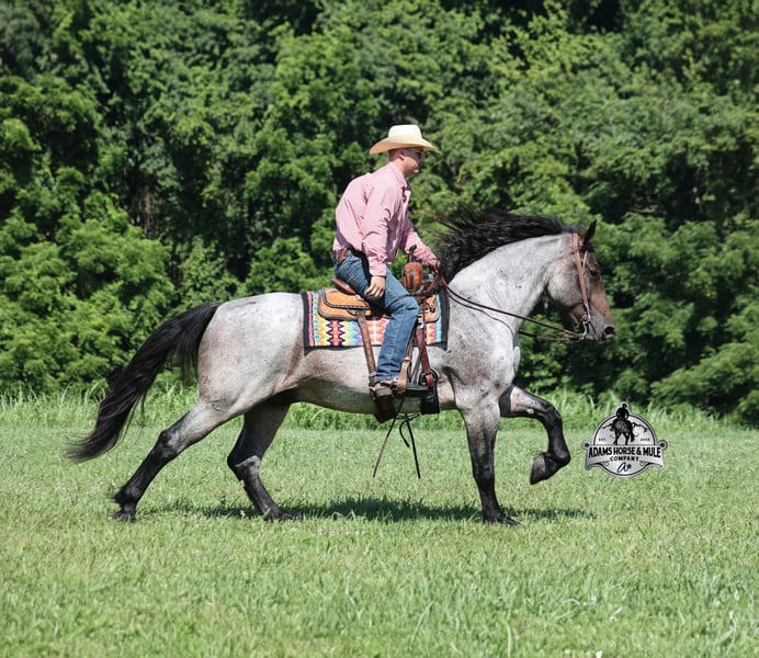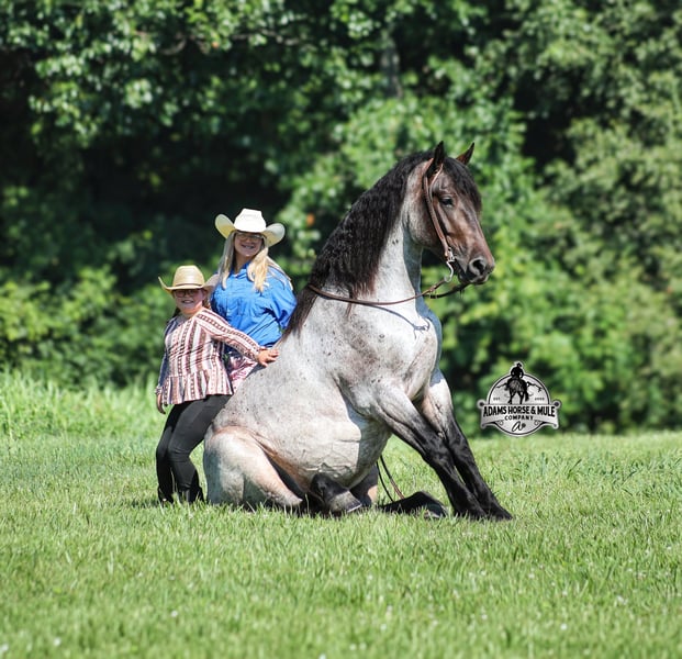 Rango is consigned to the Best Of The West Horse Sale in Gladstone, NJ on September 26-27th. You can bid online or bid in person. There is a preview day before the sale or you can come ride him prior to the sale in Mt. Vernon, KY. Rango is a 16h, 6 year old, Blue/Bay Roan Draftcross, gelding with movie star good looks, muscles upon muscles and that beautiful roan coloring you’d expect to see Rango on a Hollywood movie screen… Rango is trained to lay down and sit on command and he likes to show off his talents. He has been ridden around the ranch and used at brandings. Rango has a smooth trot, takes his leads and will lope nice circles. He neckreins around, has a good stop, sidepasses to open/shut gates and backs with ease. Rango has been exposed to all kinds of wildlife and he has been used in the mountains for hunting. Rango is great on the trails, he picks his way through rocky terrain, crosses deep water, scales slopes with ease and walks across deadfall as well. In addition to riding western he has been ridden English and has been over the jumps! Rango holds steady coming into the jumps and lands balanced. He has also been driven down the highways under harness and is traffic safe. Whether you want to ride around the ranch, trails, drive, do jumps or just lay down and take a nap together… Rango can do it all! For more info call 606-308-2461.