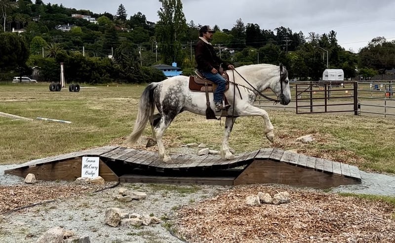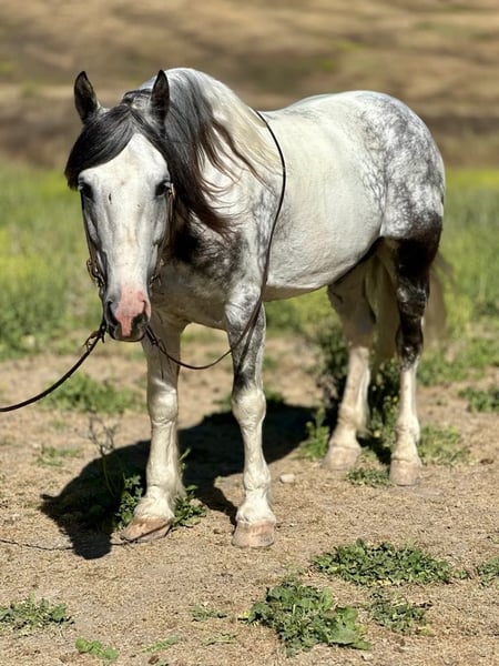 ONLINE AUCTION Place your bids at www.PlatinumEquineAuction.com Starting Bid $3500 Auction ends June 16th, 2024 Need a new saddle? Check out White Rock Saddles on our website or Facebook! Meet Koozie a 5 year old 15.2 hand dapple grey and white draft cross paint gelding. He is absolutely GORGEOUS in every way and such a good boy. He is sweet, personable, and gentle. Koozie stays quiet and easy to handle. Koozie rides western, bareback and English. He can be ridden by any rider of any level. He will walk on a loose rein all day, and move out when asked. Koozie is as comfortable as riding your lazy boy chair at every gait! He will go over small jumps in arena or fallen logs on trails. He is a trail master, will go anywhere he’s pointed. He’ll take you through the deepest water to cool off, into thick woods, or walk you right into town. He is alway on his best behavior and turns every head he passes. They don’t make them any prettier than him. Koozie has been desensitized to the flapping tarp, bouncing ball, And whipping flags! Koozie has also been used out on the ranch to gather and has doctored cattle in the pasture and been to the branding pen. This big boy travels like a horse half his size, he neck reins, collects while backing up, and uses his hind quarters when stopping. He will yield his hindquarters and responds to leg pressure. He catches both his leads effortlessly and lopes pretty perfect circles. Koozie can do rollbacks and lope right off. He has been an absolute joy to have at our ranch he will be greatly missed. Koozie cross ties, clips, bathes and is good for the farrier. He loads up easy and travels well. This gentle giant could go on to do great things. He has the soft, kind eye that makes a great horse. If you want a horse that you will fall in love with, Koozie is your man. Koozie will be the fan favorite everywhere he goes he is just stunning. Located in Paicines, CA. For more info call Longhorn Ranch Dina 831-537-1915. ONLINE AUCTION Place your bids at www.PlatinumEquineAuction.com Starting Bid $3500 Auction ends June 16th, 2024 Need a new saddle? Check out White Rock Saddles on our website or Facebook!