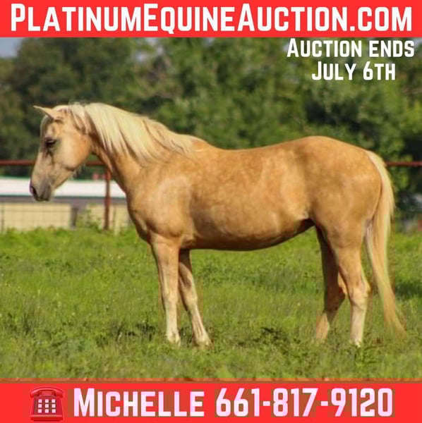 ONLINE AUCTION Place your bids at www.PlatinumEquineAuction.com Starting Bid $3500 Auction ends July 6 2025 Need a new saddle? Check out White Rock Saddles on our website or Facebook! Meet Barbie, the stunning palomino pony who’s ready to bring joy and adventure to your little cowpoke! At just 7 years old and standing at a perfect 12.1 hands tall, Barbie is the ultimate partner for kids who want to dive into the exciting world of ranch life. This beautiful blonde is all about fun and excitement! She’s been a trusty companion for several young cowboys, helping them pen cattle at sale barns and tackle the hustle and bustle of the alleys and gates. With Barbie, your child will experience the thrill of working with cattle—she doesn’t know she’s small; she works like a big horse! Barbie has explored miles of trails on the ranch, from chasing cattle to checking fences, navigating creeks, and jumping logs. She’s been to the play days. With Barbie, there’s no need for constant kicking; she has just the right amount of go and responds easily to her rider’s cues. Plus, her fantastic stop makes her a joy to ride. Despite her size, Barbie keeps up with the big horses on the trails, making her a versatile addition to any family. She’s perfect for those little beginners too—she’s been lead-lined for smaller kids and gets along wonderfully in a mixed herd with big horses. Barbie is an easy keeper—barefoot, low-maintenance, and always ready for a day of fun! If you’re looking for a pony that will keep your kids entertained for hours and create lifelong memories, Barbie is the one. Don’t miss the chance to bring this lovely palomino into your family! We are open to anyone interested in her to schedule a time to come see her or if you can’t make it schedule a FaceTime showing. If you need help with transport don’t hesitate to ask we have a list of reputable haulers that can get her safely to your doorstep WORLD WIDE including, Alaska , Mexico, Hawaii, Canada and anywhere in between. Located in Stephenville, TX. Contact M $ Performance Horses Michelle 661-817-9120 with any questions. ONLINE AUCTION Place your bids at www.PlatinumEquineAuction.com Starting Bid $3500 Auction ends July 6 2025 Need a new saddle? Check out White Rock Saddles on our website or Facebook!