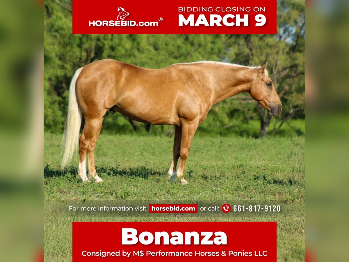 ℳ𝒶𝓇𝒸𝒽 ♦️𝐑𝐈𝐃𝐄𝐑'𝐒 𝐂𝐇𝐎𝐈𝐂𝐄♦️ Happening now thru MONDAY | MARCH 9th - Available EXCLUSIVELY on HorseBid's website! For more details and to register visit: www.Horsebid.com CONSIGNOR CONTACT: M$ Performance Horses & Ponies LLC 661-817-9120 LOCATION: Whitesboro,Texas BREED: Quarter Horse REGISTERED: No REGISTERED NAME: Bonanza COLOR: Palomino HEIGHT: 14.3 AGE: 8 GENDER: Gelding Have you been on the lookout for that perfect equine partner to share countless adventures with? Well, let me introduce you to the absolute star of the show—Bonanza! This stunning 8-year-old gelding stands at a lovely 14.3 hands and is quite possibly the prettiest blonde around! With a background that’s as diverse as they come, Bonanza has dabbled in everything from ranch work to miles of scenic trails, and he’s even spent long hours at the cow sale every week. Talk about a versatile guy! Bonanza is exceptionally well-trained. He’ll glide through perfect circles at the walk, trot, and lope in the arena, and he’s definitely got a bit of that “cowy” spirit—watch out cows, he’s the boss around here! But don’t let that cowboy demeanor fool you; he’s just as happy to take a leisurely stroll down the trail, making memories with his rider. Trustworthiness is his middle name; he always gives his best when asked. We’ve worked cattle with him without a bridle and even ridden him bareback—all while he shows off his impressive skills. If you’re searching for a lovey-dovey type horse who adores being spoiled, Bonanza is your guy! He’s the kind of ranch horse that thrives on affection. No matter where you point him, he’ll go—right down the highway, past those big semi trucks, or even to the famous historical Fort Stockyards on a bustling Saturday. His calm, confident attitude makes him a true seasoned veteran in any situation! Bonanza is also a pro at side passing to open and close gates, crossing water and bridges, and even carrying flags. There’s truly nothing this guy can’t handle! He’s a unicorn in the horse world, and I could go on and on about how perfect he is. Trust me, Bonanza is just that special! If you’re ready to add this incredible companion to your family, don’t hesitate to reach out! He is UTD on everything teeth, new shoes, vaccines and worming. You won’t have to worry about getting anything done just take him out and enjoy him. We are open to anyone interested in him to schedule a time to come see him or if you can’t make it schedule a FaceTime showing to see him. If you need help with transport don’t hesitate to ask we have a list of reputable haulers that can get him safely to your doorstep WORLD WIDE including, Alaska , Mexico, Hawaii, Canada and anywhere in between from Stephenville, TX.