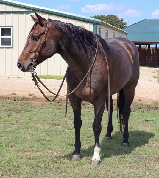 NLINE AUCTION Place your bids at www.PlatinumEquineAuction.com Starting Bid $3500 Auction ends October 27th, 2024 Need a new saddle? Check out White Rock Saddles on our website or Facebook! – a breath taking 2018 GRADE bay roan gelding. Trump stands 14.3 hands, is the definition of the American Ranch Horse- Raw boned, big brown eyed, bay roan, thick tailed, cowy, pleasure horse. Trump has been on a working ranch since day one! Trump is no stranger to long hours, rough country, and wild cattle. He is a what we like to call “handy”. He has a solid neck rein, travels correct, and always aims to please. Trump has been used in the sale barn aspect as well, where he is used to sort and load thousands of head every week. This stout boy has a vividly attractive stride and carries himself with ease. Trump has a big beautiful cross over in his turn arounds, packs his face pretty in his circles, and will get in the ground. He has never offered to buck or get cold backed with us. Trump has been introduced to the busy town and walks like a gentlemen on the trails, very confident when crosses water, down trees, steep mountains, and will never get hot or sour! He’s a very solid mount and we are so proud to offer such an exceptional gelding! He stands tied like a complete gentleman, easy to bridle and saddle, and loads/unloads himself. Trump is 100% sound and healthy! He’s been in good hands his whole life and his looks speak for themselves!! He has a Big hip and good clean legs! Don’t miss out on this opportunity, this is the perfect horse for anyone wanting a horse to put to work! For more info contact AA Ranch Emma 254-595-2168. ONLINE AUCTION Place your bids at www.PlatinumEquineAuction.com Starting Bid $3500 Auction ends October 27th, 2024 Need a new saddle? Check out White Rock Saddles on our website or Facebook!