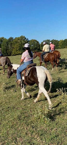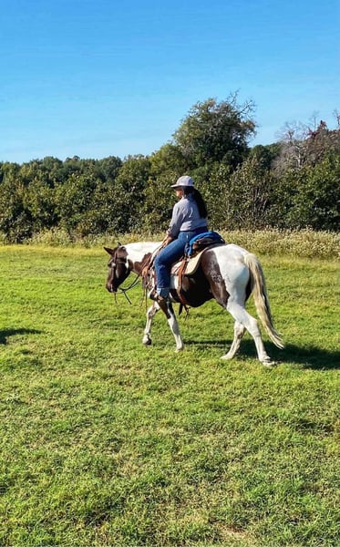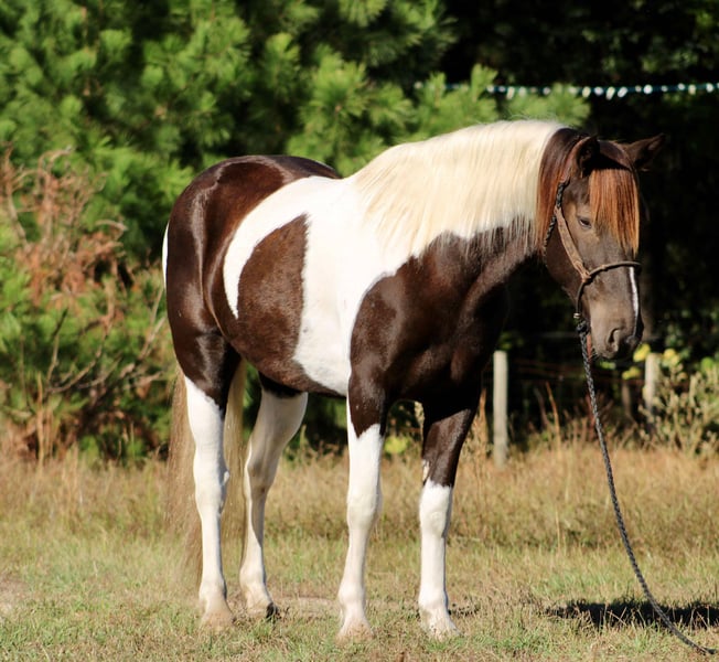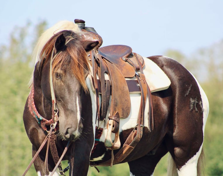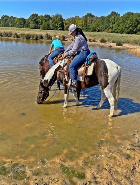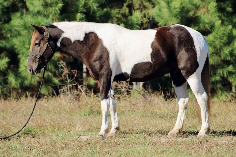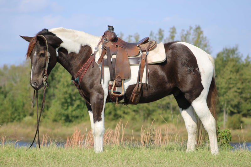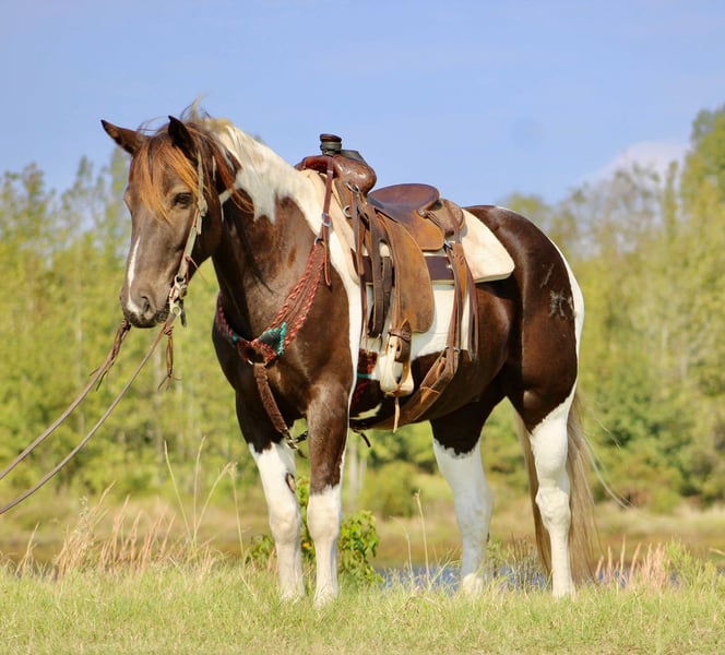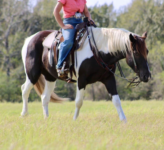 ONLINE AUCTION Place your bids at www.PlatinumEquineAuction.com Starting Bid $3500 Auction ends November 24th, 2024 Need a new saddle? Check out White Rock Saddles on our website or Facebook! Yall check this guy out! Meet Tug Boat. Tugboat is a black and white draft cross paint gelding standing 15.1 hands tall. Tug Boat is only 6 years old with lots of rides under his belt. We have used him to gather cattle using dogs, pushing cattle at a sale barn and doctoring in the pasture. He really enjoys sorting and penning and will really excel if someone wanted to continue him down that path. But not only is he a ranch horse, Tug Boat is also an exceptional trail horse. He is traffic safe; we have ridden him beside I-20 several times including riding on over passes and bridges that cross water. He loves to swim and will go right in without hesitation. Tug Boat will ride out alone or with a buddy and will go wherever you point his head. He will self load into the trailer and he stands tied quietly. Tug Boat loves people and is easy to catch, bathe, groom,shoe, deworm. He is UTD on shots, coggins, deworming and teeth. He is currently not shod but will take shoes without issues. My 5 year old son can handle this horse without worry! He gets along in a mixed herd and loves young babies! He was the weaning buddy for my colts this year. Tug Boat is a people pleaser and does his best to make his rider happy! He has a really good one hand neck rein and will turn around with the best of them. His gaits are dreamy he is so smooth it’s like floating when you’re riding him. I have really enjoyed Tug Boat the years that I have owned him and I know whoever gets him will love him just as much! If you have any questions or would like to chat about him please give Alicia Darling a call at 903-840-8010. Tug Boat is located in Canton, Texas but we work with shippers that go all over the country and I will be more than happy to help line out transport if needed! ONLINE AUCTION Place your bids at www.PlatinumEquineAuction.com Starting Bid $3500 Auction ends November 24th, 2024 Need a new saddle? Check out White Rock Saddles on our website or Facebook!
