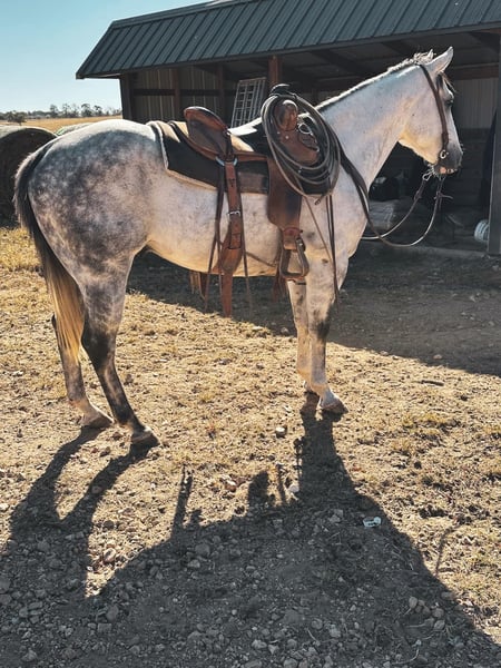 ONLINE AUCTION Place your bids at www.PlatinumEquineAuction.com Starting Bid $3500 Auction ends December 22nd, 2024 Need a new saddle? Check out White Rock Saddles on our website or Facebook! If you are on the lookout for an extremely versatile, handy, good minded, and absolutely stunning gelding to add to your life look no further! This guy is the whole package. “Goose” is a 6 year old gorgeous dapple grey gelding standing right at a perfect 15 hands tall. I do not have enough good things to say about this horse. I have throughly enjoyed every moment of being around him and he has been a barn favorite amongst everyone he meets! Goose here has all the bells and whistles you could ask for. A butter smooth one hand neck rein, super smooth walk, trot, lope both ways. He is super soft throughout his body and will side pass, stops on a dime, turns on his hind quarters, and yields to pressure phenomenally. My favorite thing about Goose is despite being so broke and soft he is ALWAYS looking for the right answer. Goose takes good care of his rider and will adjust to meet their needs experienced or not. Goose here is not shy to a hard days worth of work. He’s been day worked off of a significant amount. From catching and doctoring cattle, to checking fence lines, working the stock yards, giving lessons, trail rides, turning a few steers out of the box, and even just your good ole fun show. He has proven to be trusty in all sorts of situations! Goose here is one you can pull out of the pasture in the dead of winter and hop on with zero worries or fuss. He will be the same horse every time. Goose is also super fun to trail ride! He isn’t spooky or buddy sour. Goose is very surefooted and crosses anything you ask will ease & will be happy to boogie down any road or trail you choose! Goose is great to catch, handle, load, shoe, and bathe. He’s very easy keeping and stalls well or does great in a pasture with his pals! Despite being so well behaved, I have also come to find everywhere I go I get compliments on just how handsome he is. He is super shapey and built to last, all wrapped up in the prettiest shade of dapple grey you will find on one! This is such a nice gelding with loads of potential to do absolutely anything in the world with. You do not want to miss out on him. Come meet him, you are sure to fall in love just as I have! He is located in Fulton MO. Feel free to reach out and call/text Brenna Hurt 660-676-2592 with any further questions! Thanks for looking, and God bless! ONLINE AUCTION Place your bids at www.PlatinumEquineAuction.com Starting Bid $3500 Auction ends December 22nd, 2024 Need a new saddle? Check out White Rock Saddles on our website or Facebook!