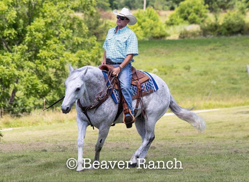 NLINE AUCTION Place your bids at www.PlatinumEquineAuction.com Starting Bid $3500 Auction ends August 4th, 2024 Need a new saddle? Check out White Rock Saddles on our website or Facebook! Ruf N Revolutionary…..Better Known as “Einstein “around the barn . He is a Registered AQHA grey gelding. Who is 15 hands tall and 16 years old. Don’t let his age fool you he feels and looks like a 6 yr old. This is one of them hard to find . Great bred and broke seasoned geldings . That will take you anywhere and do anything. He is sound with no maintenance. He is an own son of the great sire “Einsteins Revolution “. He has been shown In the reining and ranch versatility. Last month was the first time we showed him in two years . Where he finished second in a large group of 18 talented horses. In the reining class. The kids have started him over fences which he absolutely loves. Einstein went to his first hunter show last week where he win the flat class and the 2’6 over fences. This week he guided our weekly dude string of horses on trail rides . This guy will be there every morning to greet you at the gate . Ready to enjoy whatever days job you give him .He lives outside 24/7. Einstein is one of our top horses in the trail riding string of horses. Takes all obstacles out on the trail and is very easy to maneuver .He is extremely broke and goes through all obstacles with ease. Einstein has been a pony horse at the racetrack as well. This guy will meet you at the gate every morning with a ready to work attitude. Very easy to catch and get along with. He is totally up to date on vet/farrier /dental and has all necessary paperwork and vaccines all ready to go.Also comes with a clean vetting.. We can help with shipping anywhere from coast to coast. We strongly encourage customers to come out and try our horses . Einstein is located in Mt. Grove, MO. Call Beaver Ranch Mike 410-490-7384 for more info. ONLINE AUCTION Place your bids at www.PlatinumEquineAuction.com Starting Bid $3500 Auction ends August 4th, 2024 Need a new saddle? Check out White Rock Saddles on our website or Facebook!
