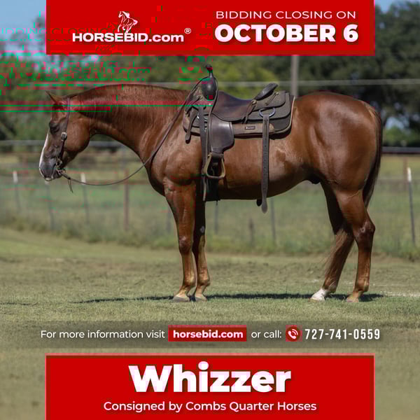 🍂 𝓐𝓾𝓽𝓾𝓶𝓷 𝑨𝑳𝑳 𝑺𝑻𝑨𝑹 𝑳𝑰𝑵𝑬𝑼𝑷 🍂 Happening now thru MONDAY | OCTOBER 6th - Available EXCLUSIVELY on HorseBid's website! For more details and to register visit: www.Horsebid.com CONSIGNOR CONTACT: Combs Quarter Horses 727-741-0559 LOCATION: Cleburne, Texas BREED: AQHA REGISTERED: Yes REGISTERED NAME: DUNISTADOR COLOR: Sorrel HEIGHT: 15 AGE: 7 GENDER: Gelding Phenomenal gelding you can take to the shows and truly enjoy as a family horse! Dunistador (Conquistador Whiz x Sly Dun Jewel) 2018 AQHA sorrel gelding standing a solid built 15h PEDIGREE: Whizzer is by the one and only 2 million dollar sire Conquistador Whiz. Known for his big stops, he was the stallion to win the NRBC and NRHA derby back to back. Grandsire is Topsail Whiz the legendary 12 million dollar sire earning 57k in the NRHA himself. Sly Dun Jewel is by the infamous Hollywood Dun It the record breaking American quarter horse and reining icon! Earning over 65k in the NRHA and producing over 7.7 million! SHOW EXPERIENCE: Whizzer is a natural in the show ring! Very comfortable and right at home. He’s been shown at the local shows in the reining, the ranch rail and the ranch trail. Requires no big show prep. You can easily maintain him at home without a trainer. Whizzer is the type of Reiner everyone can learn to ride a Reiner on. He’s responsive to your seat and leg but not overly responsive or overly sensitive. He will go just as fast or as slow as you’d like. He’s got a comfortable jog, an extremely nice, easy consistent lope, automatic lead changes an easy stop and turns around correct on a full drape! ENGLISH EXPERIENCE: Whizzer also hacks around English and goes over the jumps with super cute knees! He’s so open minded and willing you could take him to the hunter classes and really hold your own! He packs his head low and correct and goes right to the jumps! TRAIL EXPERIENCE: Whizzer loves to trail ride!! Down the road, through the woods or take him swimming! He loves going new places!! He doesn’t mind traffic, dogs or wildlife. He goes up and down the big hills carefully and easily and he goes right into the water! He loves to play and splash in the river! He will ride front, middle or back of the pack. He doesn’t mind at all! DISPOSITION: Whizzer is extremely sweet and loves being loved on. He comes right to you and puts his head in the halter. He loves kisses and having his ears scratched. Whizzer is also very quiet and easy to ride. He’s got a very got with flow way about him and he can take a joke. He doesn’t get upset when his rider gets off balance or in his face. He’s very forgiving! He would really make an excellent addition to a lesson program or just a casual rider wanting a very broke horse to enjoy! UPKEEP: Whizzer is an easy keeper. He’s currently eating alfalfa hay and 1 1/2 scoops of a basic pellet twice a day. He is UTD on everything and currently in shoes all the way around. He has been and can be ridden barefoot as well. LOADING: Whizzer loads and hauls like a dream. Very quiet and patient in the trailer. He also stands quietly tied to the trailer at the trails and horse shows. TURNOUT: Whizzer can be on single or group turnout. We’ve had him out with mares and geldings without a fussing or drama. GROUND MANNERS: Whizzer is great on the ground. Respectful of personal space. He stands like a dream for grooming, washing, saddling, mounting block and he takes the bit easily. He will stand single tied and crosstied. Doesn’t mind dogs or goats around his feet. BAD HABITS/ VICES: Whizzer has no bad habits or vices. Absolutely no buck, rear, bolt, bite or kick. TACK: We’ve ridden Whizzer is anything from a halter and lead rope to a snaffle to a correction bit. Our go to bit of choice for him is a medium shank snaffle but he’s really not picky.